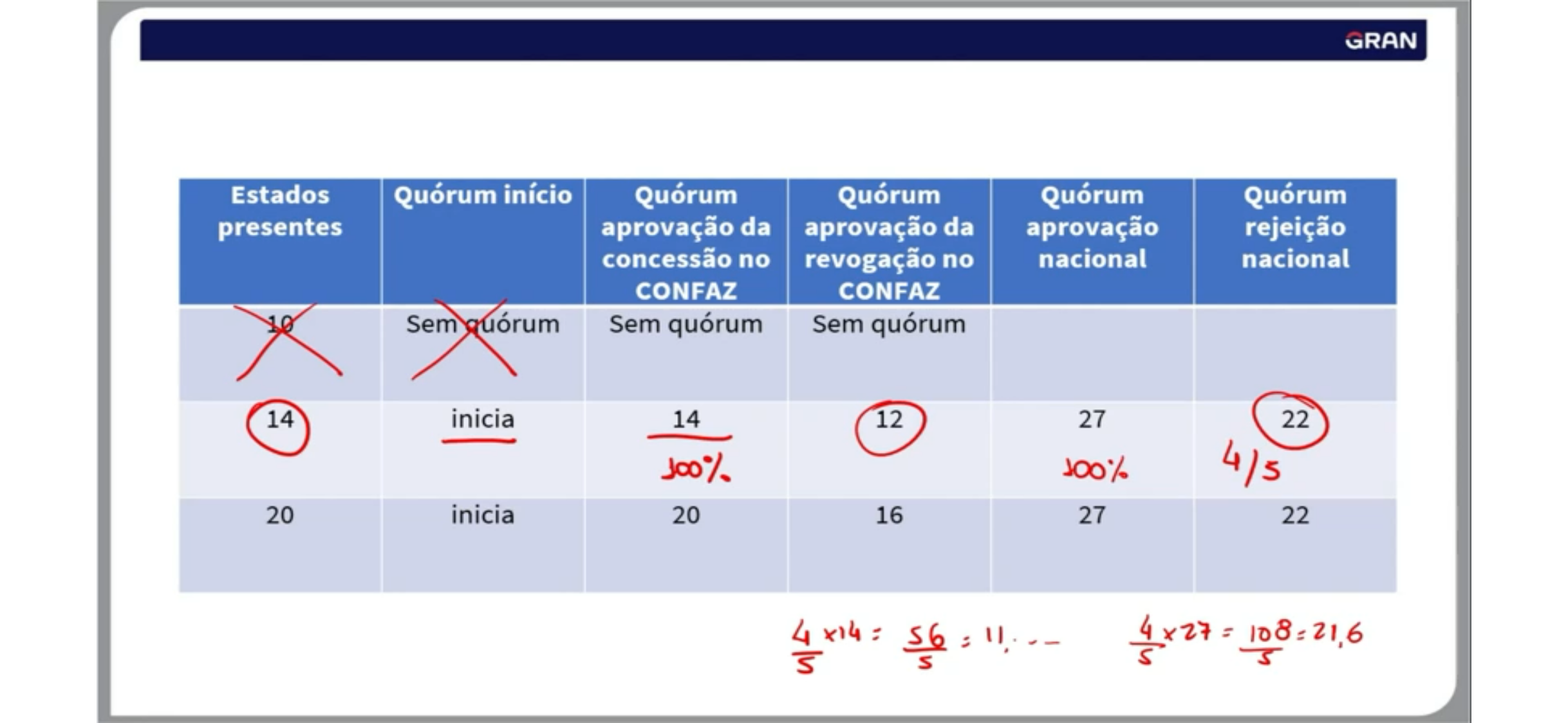 GRAN Estados Quórum início Quórum Quórum Quórum Quórum presentes aprovação da aprovação da aprovação rejeição concessão no revogação no nacional nacional CONFAZ CONFAZ 10 Sem Sem quórum Sem quórum 14 inicia 14 12 27 22 100% 100% 4/5 20 inicia 20 16 27 22 4 : 56 : 11