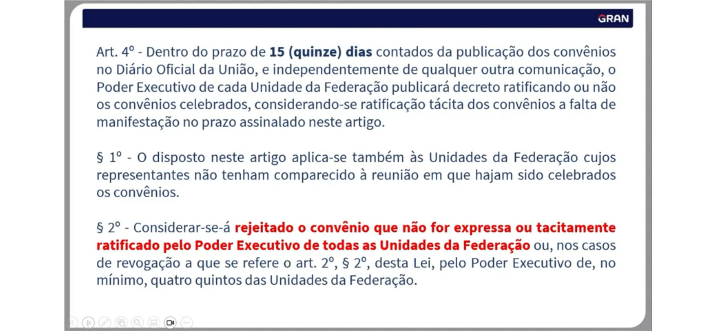 GRAN Art. 4° Dentro do prazo de 15 (quinze) dias contados da publicação dos convênios no Diário Oficial da União, e independentemente de qualquer outra comunicação, Poder Executivo de cada Unidade da Federação publicará decreto ratificando ou não os convênios celebrados, considerando-se ratificação tácita dos convênios a falta de manifestação no prazo assinalado neste artigo. 1° disposto neste artigo aplica-se também às Unidades da Federação cujos representantes não tenham comparecido à reunião em que hajam sido celebrados os convênios. 2° Considerar-se-á rejeitado convênio que não for expressa ou tacitamente ratificado pelo Poder Executivo de todas as Unidades da Federação ou, nos casos de revogação a que se refere art. 2°, 2°, desta Lei, pelo Poder Executivo de, no mínimo, quatro quintos das Unidades da Federação.