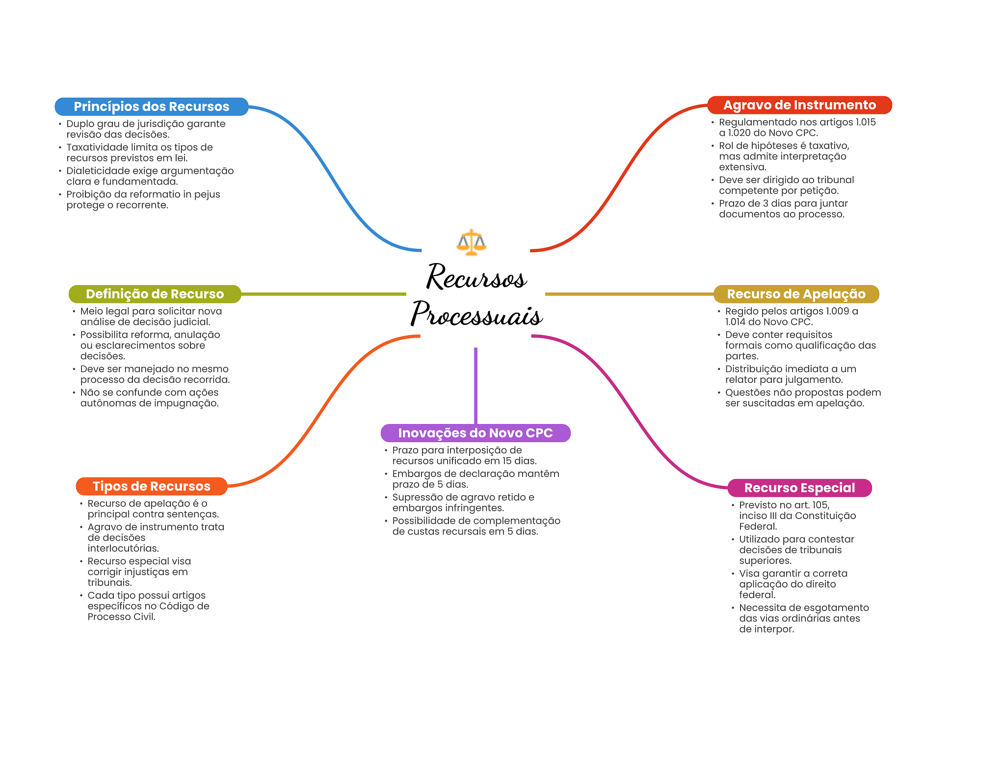 Princípios dos Recursos Agravo de Instrumento Duplo grau de jurisdição garante Regulamentado nos artigos 1.015 revisão das decisões. a 1.020 do Novo CPC. Taxatividade limita OS tipos de Rol de hipóteses é taxativo, recursos previstos em lei. mas admite interpretação Dialeticidade exige argumentação extensiva. clara e fundamentada. Deve ser dirigido ao tribunal Proibição da reformatio in pejus competente por petição. protege recorrente. Prazo de 3 dias para juntar documentos ao processo. Recursos Definição de Recurso Recurso de Apelação Meio legal para solicitar nova Processuais Regido pelos artigos 1.009 a análise de decisão judicial. 1.014 do Novo CPC. Possibilita reforma, anulação Deve conter requisitos ou esclarecimentos sobre formais como qualificação das decisões. partes. Deve ser manejado no mesmo Distribuição imediata a um processo da decisão recorrida. relator para julgamento. Não se confunde com ações Questões não propostas podem autônomas de impugnação. ser suscitadas em apelação. Inovações do Novo Prazo para interposição de recursos unificado em 15 dias. Embargos de declaração mantêm Tipos de Recursos prazo de 5 dias. Recurso Especial Supressão de agravo retido e Recurso de apelação é embargos infringentes. Previsto no art. 105, principal contra sentenças. Possibilidade de complementação inciso III da Constituição Agravo de instrumento trata Federal. de custas recursais em 5 dias. de decisões Utilizado para contestar interlocutórias. decisões de tribunais Recurso especial visa superiores. corrigir injustiças em Visa garantir a correta tribunais. aplicação do direito Cada tipo possui artigos federal. específicos no Código de Necessita de esgotamento Processo Civil. das vias ordinárias antes de interpor.