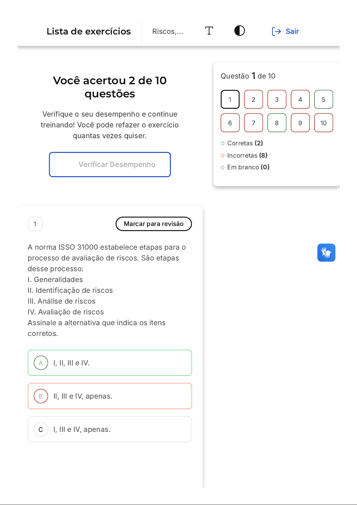 Você acertou 2 de 10 questões Verifique o seu desempenho e continue treinando! Você pode refazer o exercício quantas vezes quiser. Verificar Desempenho A B C 1 Marcar para revisão A norma ISSO 31000 estabelece etapas para o processo de avaliação de riscos. São etapas desse processo: I. Generalidades II. Identificação de riscos III. Análise de riscos IV. Avaliação de riscos Assinale a alternativa que indica os itens corretos. I, II, III e IV. II, III e IV, apenas. I, III e IV, apenas. Questão 1 de 10 Corretas (2) Incorretas (8) Em branco (0) 1 2 3 4 5 6 7 8 9 10 Lista de exercícios Riscos,… Sair D E A B C I, II e IV, apenas. I e III, apenas. Resposta incorreta Opa! A alternativa correta é a letra A. Confira o gabarito comentado! Gabarito Comentado Segundo a norma ISO 31000, o processo de avaliação de riscos engloba as seguintes etapas: Generalidades, Identificação de riscos, Análise de riscos e Avaliação de riscos. 2 Marcar para revisão Existe uma ferramenta utilizada para realizar o levantamento dos prejuízos decorrentes das ameaças, fraquezas e perdas inerentes aos riscos no planejamento estratégico. Que ferramenta é essa? Diagrama de Ishikawa. Gráfico de Pareto. Análise de Valor Agregado (EVA). D E Análise SWOT. Matriz BCG. Resposta incorreta Opa! A alternativa correta é a letra D. Confira o gabarito comentado! Gabarito Comentado O gerenciamento dos riscos permite que os resultados inerentes às atividades profissionais sejam avaliados de modo que as consequências não desejadas tenham seu impacto minimizado, com redução do prejuízo em relação aos objetivos da organização. Vinculados a ameaças, fraquezas e perdas inerentes aos riscos, tais prejuízos podem ser discutidos a partir do levantamento realizado pelo planejamento estratégico com a ferramenta de Matriz SWOT. 3 Marcar para revisão As variáveis do ambiente externo a organização podem ser consideradas positivas ou negativas. São variáveis negativas I. Ameaças II. Restrições III. Incentivos IV. Problemas V. Sintomas negativos Assinale a alternativa que indica os itens corretos. A B C D E I, II, III e IV, apenas. I, II, III e V, apenas. I, II, IV e V, apenas. I, III, IV e V, apenas. II, III, IV e V, apenas. Resposta incorreta Opa! A alternativa correta é a letra C. Confira o gabarito comentado! Gabarito Comentado São variáveis negativas: Ameaças, Restrições, Problemas e Sintomas negativos. Incentivos são variáveis positivas. 4 Marcar para revisão O gerenciamento dos riscos possui uma normatização dada por meio da organização internacional International Organization for Standardization, mais conhecida como ISO. São princípios que devem ser atendidos para que a gestão de riscos seja eficaz: I. Integrar todos os processos organizacionais II. Criar e proteger valor III. Abordagem explícita das incertezas A B C D E IV. Devem ser considerados fatores culturais e humanos Assinale a alternativa que indica os itens corretos. I, II, III e IV. I e II, apenas. II e III, apenas. II e IV, apenas. II, III e IV, apenas. Resposta incorreta Opa! A alternativa correta é a letra A. Confira o gabarito comentado! Gabarito Comentado Os princípios para uma gestão de riscos eficaz, de acordo com a normatização da International Organization for Standardization (ISO), incluem a integração de todos os processos organizacionais, a criação e proteção de valor, a abordagem explícita das incertezas e a consideração de fatores culturais e humanos. Além disso, a gestão de riscos deve fazer parte da tomada de decisões, ser sistemática, estruturada e oportuna, basear-se nas melhores informações disponíveis, ser feita sob medida, ser transparente e inclusiva, ser dinâmica, interativa e capaz de reagir às mudanças, e facilitar a melhoria contínua da organização. Portanto, a A B C D E alternativa correta é a "A", que inclui todos os itens mencionados no enunciado. 5 Marcar para revisão As organizações devem estar atentas às oportunidades internas e externas que surgem no ambiente corporativo, além de gerenciar os riscos associados a essas variáveis. Peter Drucker (2002) propõe uma forma para as organizações buscarem oportunidades internas e externas (DRUCKER, P. F.A administração na próxima sociedade. São Paulo: Nobel, 2002.). Assinale a alternativa que indica qual é esse meio. Gestão de riscos. Planejamento estratégico. Inovação sistemática. Análise de forças e limitações. Adequação ao ambiente interno. Resposta correta Parabéns, você selecionou a alternativa correta. Confira o gabarito comentado! Gabarito Comentado A B Além do gerenciamento dos riscos, as organizações, de acordo com as variáveis que influenciam o ambiente corporativo, também precisam estar sempre atentas às oportunidades internas e externas. Um dos meios de buscá-las é definido por Peter Drucker (2002) como inovação sistemática. Este conceito se refere à necessidade de as organizações buscarem meios além das informações já registradas internamente (afinal, elas naturalmente tendem a apresentar o histórico do passado, não sendo capazes de registrar perspectivas futuras). Além de consultarem as valiosas informações produzidas, os gestores também devem estar atentos às novas oportunidades de inovação. 6 Marcar para revisão Zaccarelli (1980) identifica três tipos de riscos que devem ser considerados no plano estratégico. (ZACCARELLI, S. B. A formulação de alternativas estratégicas.In: Revista de administração. São Paulo: FEA/USP, 1980.) Assinale a alternativa que indica esses três tipos de risco. Riscos associados a questões financeiros, riscos ligados a operação e riscos inerentes ao mercado. Riscos internos, riscos externos e riscos macroambientais. C D E Riscos de segurança, riscos microambientais e riscos de saúde. Riscos relacionados à compatibilidade, riscos relacionados à evolução futura do ambiente empresarial e riscos relacionad