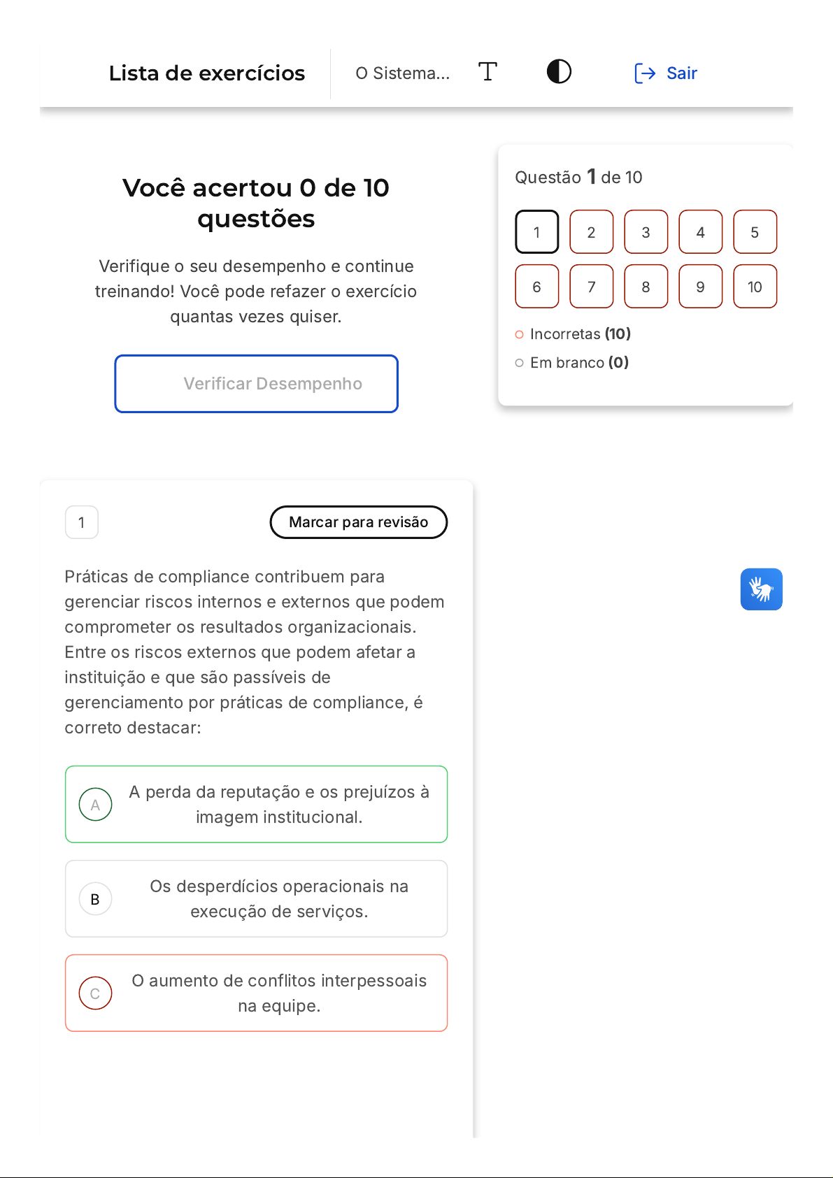 Você acertou 0 de 10 questões Verifique o seu desempenho e continue treinando! Você pode refazer o exercício quantas vezes quiser. Verificar Desempenho A B C 1 Marcar para revisão Práticas de compliance contribuem para gerenciar riscos internos e externos que podem comprometer os resultados organizacionais. Entre os riscos externos que podem afetar a instituição e que são passíveis de gerenciamento por práticas de compliance, é correto destacar: A perda da reputação e os prejuízos à imagem institucional. Os desperdícios operacionais na execução de serviços. O aumento de conflitos interpessoais na equipe. Questão 1 de 10 Incorretas (10) Em branco (0) 1 2 3 4 5 6 7 8 9 10 Lista de exercícios O Sistema… Sair D E A redução da produtividade. O aumento dos custos de transação. Resposta incorreta Opa! A alternativa correta é a letra A. Confira o gabarito comentado! Gabarito Comentado As práticas de compliance são ferramentas de gestão que auxiliam as organizações a evitar situações negativas, gerenciando riscos internos e externos que podem comprometer os resultados. Dentre esses riscos, a alternativa A destaca a perda da reputação e os prejuízos à imagem institucional. Esses são riscos externos que podem ser gerenciados por práticas de compliance, pois envolvem a percepção do público e do mercado sobre a organização. Escândalos éticos e financeiros decorrentes da conduta inadequada da alta administração, por exemplo, podem resultar em prejuízo para a credibilidade moral (imagem) da instituição. Portanto, a alternativa A está correta. 2 Marcar para revisão Sempre que possível, é recomendado documentar todas as ações de apoio da alta administração às práticas de governança corporativa, gerenciamento de riscos e A B C D E compliance. Qual é o objetivo da documentação dessas ações de apoio da alta administração? Aumentar o volume de informações a serem gerenciadas pela organização. Facilitar o cumprimento das exigências legais e regulamentares. Substituir o papel da auditoria interna na verificação das práticas de governança corporativa. Garantir a confidencialidade das informações da organização. Comprovar, de forma clara e objetiva, o atendimento aos requisitos estabelecidos. Resposta incorreta Opa! A alternativa correta é a letra E. Confira o gabarito comentado! Gabarito Comentado Todas as ações de apoio da alta administração às práticas de governança corporativa, incluindo as de gerenciamento de riscos e compliance, devem, sempre que possível, ser documentadas. A formalização pode ser feita por meio de vídeos, cartas, memorandos, atas de reunião, ofícios e divulgação na intranet, além de outros meios de comunicação que sejam vistos como adequados. A documentação registrada tem o objetivo de comprovar, de forma clara e objetiva, o A B C atendimento aos requisitados estabelecidos (ROCHA JÚNIOR; GIZZI, 2018). ROCHA JÚNIOR, F. A. R. M.; GIZZI, G. F. T. B. Fraudes corporativas e programas de compliance. Curitiba: InterSaberes, 2018. 3 Marcar para revisão As ações de GRC trazem muitos benefícios gerenciais para as organizações e seus stakeholders. Entretanto, para além dos benefícios gerenciais, existem obrigações legais que devem ser cumpridas. Quais são as obrigações legais para atendimento às normas de governança corporativa? Divulgação de informações confidenciais e garantia de independência na atuação da auditoria externa. Controle externo sobre os processos e relações com o mercado. Realização de auditorias internas e criação de comitês para supervisionar as atividades. D E Garantia de independência na atuação da auditoria interna e transparência nas relações com o mercado. Divulgação de informações contábeis confiáveis, garantia de controle interno sobre os processos, transparência nas relações com o mercado, realização de auditorias externas e criação de comitês para supervisionar as atividades. Resposta incorreta Opa! A alternativa correta é a letra E. Confira o gabarito comentado! Gabarito Comentado Além dos incentivos de gestão para a implementação da governança corporativa, não podemos deixar de considerar certas obrigações legais de atendimento às normas: Divulgação de informações contábeis confiáveis; garantia de controle interno sobre os processos; transparência nas relações com o mercado; realização de auditorias externas; criação de comitês para supervisionar as atividades; e garantia de maior independência na atuação da auditoria externa (DEFOND; FRANCIS, 2005). DEFOND, M. L.; FRANCIS, J. R. Audit research after Sarbanes-Oxley. Auditing: a journal of practice & theory. v. 24. 2005. p. 5-30. A B C D E 4 Marcar para revisão A integração da governança corporativa com o compliance e a gestão de riscos gera uma série de benefícios para as organizações, são eles: I. O resultado das atividades apresenta um maior padrão de desempenho II. Atuação corporativa com maior ética e integridade III. Aperfeiçoamento na aplicação dos recursos IV. Práticas frágeis de gestão com potencial para aumentar o custo de capital Assinale a alternativa que indica os itens corretos. I, II e III. I, II, III e IV. II, III e IV. I e IV. II e IV. Resposta incorreta Opa! A alternativa correta é a letra A. Confira o gabarito comentado! Gabarito Comentado I. O resultado das atividades apresenta um maior padrão de desempenho - correto II. Atuação corporativa com maior ética e integridade - correto III. Aperfeiçoamento na aplicação dos recursos - correto. IV. Práticas frágeis de gestão com potencial A B C D E para aumentar o custo de capital - incorreto. Esta é uma situação que pode ser evitada com o uso adequado de ferramentas de gestão. 5 Marcar para revisão O sistema GRC oferece diversos benefícios para as organizações. Assinale a alternativa que indica um dos benefícios da integração da governa
