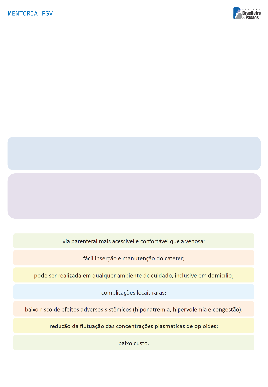 www.romulopassos.com.br 1 Hipodermóclise A hipodermóclise é também conhecida como a administração contínua de fluidos por via SC. O mecanismo da hipodermóclise consiste na infusão lenta de soluções no tecido subcutâneo, onde o fluido é transferido para circulação sanguínea por ação combinada entre a difusão e a perfusão tecidual (BRASIL, 2017a). É utilizada no contexto da geriatria e dos cuidados paliativos, em pacientes com desidratação moderada devido a quadros de disfagia severa, demência, sonolência, obstrução intestinal secundária à neoplasia e impossibilidade de punção de acesso venoso periférico (BRUNO, 2015). Quando utilizada para administração de medicamentos, considera-se o termo terapia SC (CARVALHO; PARSONS, 2012). Vantagens 3º Simulado ENARE/FGV Administração e Cálculo de Medicamentos Terça, às 20h www.romulopassos.com.br 2 Desvantagens 1. (FUNSAÚDE-CE/FGV/2021) A respeito dos critérios de administração de fluidos e medicamentos por meio da hipodermóclise, analise as afirmativas a seguir e assinale (V) para a verdadeira e (F) para a falsa. (_) A região do deltoide, a torácica e a abdominal são locais adequados para a realização das punções. (_) As soluções coloidais com teor de glicose >5% podem ser administradas por meio da hipodermóclise. (_) A hipodermóclise permite a administração de até 1.500 ml em 24h, por sítio de punção. As afirmativas são, na ordem apresentada, respectivamente, a) F - V - F. d) V - V - V. b) V - F - V. e) F - F - V. c) F - F - F. 2. (ALETO/FGV/2024) Assinale a opção que corresponde a uma contraindicação absoluta para administração de medicamentos por hipodermóclise. a) Disfagia. b) Confusão mental. c) Obstrução intestinal. d) Demência avançada. e) Trombocitopenia grave. 3. (TJ-DFT/FGV/2022) Entre os medicamentos indicados para administração por hipodermóclise estão: a) diazepam e diclofenaco. b) potássio > 20 mmol/l e NPT. c) dipirona e ampicilina. d) soluções coloidais e fenitoína. e) glicose > 5% e eletrólitos não diluídos. www.romulopassos.com.br 3 4. (TRT-PB/FGV/2022) A Hipodermóclise é uma via de acesso subcutâneo para hidratação parenteral e administração de medicamentos. Entre os medicamentos que não devem ser administrados por essa via está a) a morfina. b) a atropina. c) a dipirona. d) a furosemida. e) o diclofenaco. O COREN/SP emitiu um Parecer Técnico nº 39/2012 que sugere os volumes máximos a serem administrados de acordo com a faixa etária e o local: 5. (Prefeitura do Município de Cuiabá-MT/FGV/2015) A injeção intramuscular pode ser aplicada em vários locais do corpo, dependendo da idade, da capacidade do músculo e do volume a ser injetado. Com base nesses critérios, analise as afirmativas a seguir. I. A região ventro-glútea é considerada bastante segura e indicada em todas as faixas etárias. II. A região do deltoide é contraindicada em crianças de 0 a 10 anos e para volumes acima de 2 ml. III. A região dorso-glútea é a mais indicada para crianças de 0 a 2 anos. www.romulopassos.com.br 4 5. (Prefeitura do Município de Cuiabá-MT/FGV/2015) Assinale: a) se somente a afirmativa I estiver correta. b) se somente a afirmativa II estiver correta. c) se somente a afirmativa III estiver correta. d) se somente as afirmativas I e II estiverem corretas. e) se somente as afirmativas II e III estiverem corretas. 6. (Prefeitura de Osasco-SP/FGV/2014) No que se refere à administração de medicação intramuscular, analise as afirmativas a seguir. I. A região ventro-glútea é considerada a mais segura e pode ser utilizada em qualquer faixa etária, incluindo idosos, indivíduos magros e crianças. II. O principal músculo da região dorsoglútea é o glúteo médio, capaz de suportar grandes quantidades de medicamentos. III. O músculo deltoide suporta até 2 ml de medicação e é o local mais indicado para aplicação de injeções em crianças. Assinale: a) se somente a afirmativa I estiver correta. b) se somente a afirmativa II estiver correta. c) se somente a afirmativa III estiver correta. d) se somente as afirmativas I e II estiverem corretas. e) se somente as afirmativas II e III estiverem corretas. 7. (Câmara Municipal de Aracajú-SE/FGV/2021) Ao administrar uma medicação intramuscular, o profissional de enfermagem deve escolher o local de acordo com alguns aspectos técnicos. Sobre o tema, analise as afirmativas a seguir, assinalando V para a(s) verdadeira(s) e F para a(s) falsa(s). (_) A injeção na região dorso-glútea deve ser feita no músculo glúteo médio. (_) O volume máximo recomendado para aplicação no deltoide é de 4 ml. (_) A região ventro-glútea não apresenta contraindicação e é considerada bastante segura para qualquer faixa etária. A sequência correta é: a) F, F, F. d) V, F, F. b) V, F, V. e) F, F, V. c) F, V, F. www.romulopassos.com.br 5 8. (TRT-PB/FGV/2022) Suponha que será necessário administrar 5 ml de uma medicação pela via intramuscular. Assinale a região que, nesse caso, é mais segura e suporta o volume total. a) glúteo. b) deltoide. c) ventroglútea. d) vasto lateral da coxa. e) reto femoral. Técnica em Z em injeções IM 1 - Acoplar uma nova agulha à seringa, após o preparo do medicamento, de modo que nenhuma solução permaneça na parte externa da haste da agulha. 2 - Selecionar o sítio de aplicação, preferencialmente um músculo largo e profundo, como o ventroglúteo. 3 - Depois da antissepsia da pele, puxar a pele lateralmente ou para baixo por cerca de 2,5 a 3 cm. 4 - Segurar a pele nessa posição e inserir a agulha profundamente no músculo. 5 - Realizar a aspiração e injetar o medicamento a uma velocidade de 10 segundos por ml, caso não haja retorno de sangue. 6 - Manter a agulha inserida por 10 segundos, para permitir que o medicamento se disperse uniformemente, em vez de retornar no sentido da agulha. 7 - Liberar a pele, depois de retirar a agulha, o que pr