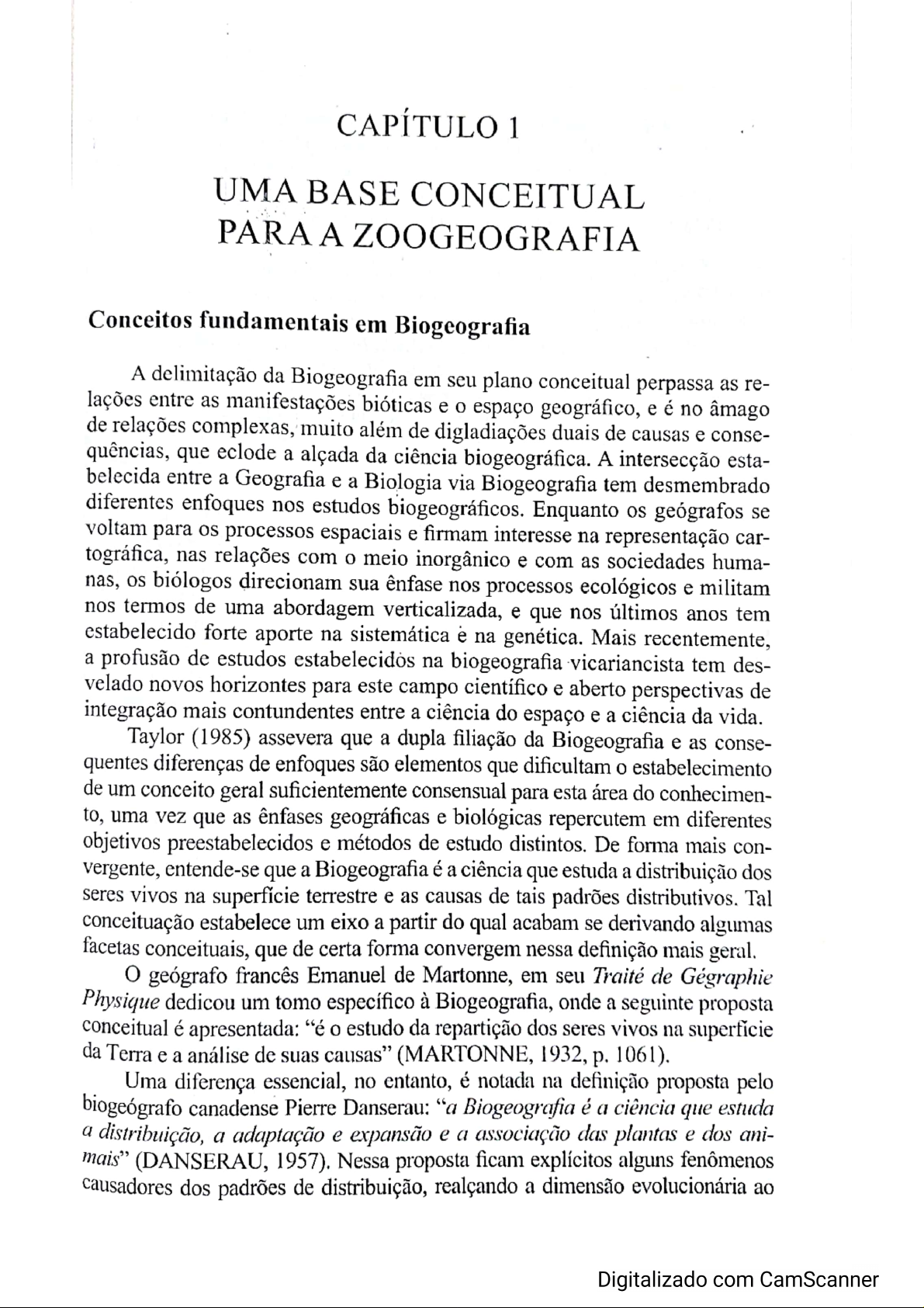 CAPÍTULO 1 UMA BASE CONCEITUAL PARA A ZOOGEOGRAFIA Conceitos fundamentais em Biogeografia A delimitação da Biogeografia em seu plano conceitual perpassa as re- lações entre as manifestações bióticas e o espaço geográfico, e é no âmago de relações complexas, muito além de digladiações duais de causas e conse- quências, que eclode a alçada da ciência biogeográfica. A esta- belecida entre a Geografia e a Biologia via Biogeografia tem desmembrado diferentes enfoques nos estudos biogeográficos. Enquanto os geógrafos se voltam para os processos espaciais e firmam interesse na representação car- tográfica, nas relações com o meio inorgânico e com as sociedades huma- nas, os biólogos direcionam sua ênfase nos processos ecológicos e militam nos termos de uma abordagem verticalizada, e que nos últimos anos tem estabelecido forte aporte na sistemática è na genética. Mais recentemente, a profusão de estudos na biogeografia vicariancista tem des- velado novos horizontes para este campo científico e aberto perspectivas de integração mais contundentes entre a ciência do espaço e a ciência da vida. Taylor (1985) assevera que a dupla filiação da Biogeografia e as conse- quentes diferenças de enfoques são elementos que dificultam o estabelecimento de um conceito geral suficientemente consensual para esta área do conhecimen- to, uma vez que as ênfases geográficas e biológicas repercutem em diferentes objetivos preestabelecidos e métodos de estudo distintos. De forma mais con- vergente, entende-se que a Biogeografia é a ciência que estuda a distribuição dos seres vivos na terrestre e as causas de tais padrões distributivos. Tal conceituação estabelece um eixo a partir do qual acabam se derivando algumas facetas conceituais, que de certa forma convergem nessa definição mais geral. O geógrafo francês Emanuel de Martonne, em seu Traité de Gégraphie Physique dedicou um tomo específico à Biogeografia, onde a seguinte proposta conceitual é apresentada: "é o estudo da repartição dos seres vivos na superficie da Terra e a análise de suas causas" (MARTONNE, 1932, p. 1061). Uma diferença essencial, no entanto, é notada na definição proposta pelo biogeógrafo canadense Pierre Danserau: "a Biogeografia é a ciência que estuda a distribuição, a adaptação e expansão e a associação das plantas e dos ani- mais" (DANSERAU, 1957). Nessa proposta ficam explícitos alguns fenômenos causadores dos padrões de distribuição, realçando a dimensão evolucionária ao Digitalizado com CamScanner12 a questão da adaptação dos e da organismos própria expansão, se adaptarem que pressupõe a novos 0 mencionar meno da dispersão e da a interferência capacidade de processos vivos ecológicos formando ao aventar a ideia associação, tes. Ressalta também inter-relações entre os seres Biogeografia comunidades Pela concepção logo, das de Quintanilla (1974), a "É disciplina da Geografia que estuda a uma e animais, na superficie do vivos, plantas explicar as causas que determinam esta objetivo agrupamento em comunidades e as relações com outros elementos do mundo fisico e humano". Nesta proposta, a variação consiste numa explicitação das relações en- tre os seres vivos e o meio físico e, não menos, com o homem, mantendo a ideia geral focada no estudo da distribuição dos seres vivos e no desvenda- mento de suas causas. Nas palavras do geógrafo brasileiro Helmut Troppmair, "A Biogeografia estuda as interações, a organização e os processos espaciais, dando ênfase aos seres vivos vegetais e animais que habitam determinado local: 0 biótopo onde constituem biocenoses" (TROPPMAIR, 2012, p. 1). Prosseguindo, 0 autor elucida que objeto da Biogeografia são OS seres vivos, inclusive homem, quando visto como integrante de uma determinada biocenose, partilhando das cadeias tróficas e dependente das condições ambientais vigentes. Já 0 objetivo da Biogeografia fica estabelecido como de estudar os seres vivos, sua partici- pação na composição da estrutura, das inter-relações e dos processos vigentes nos geossistemas, se pautando em uma visão sistêmica têmporo-espacial. A definição de Troppmair (2012) é mais abrangente, pois insere a Biogeografia em um contexto de organização do espaço. Por este ponto de vista, a Biogeografia fica submetida à Geografia, uma vez que, explicitamen- te, ela se volta para o estudo de processos e organizações espaciais, objetivo fundamental da ciência geográfica, mas direciona ênfase nos seres vivos, objeto primordial da Biogeografia, que fica assim inserida nas abordagens de cunho espacial. A proposta conceitual acima mencionada também traz dois termos importantes para a Biogeografia: biótopo e biocenose. O biótopo vem a ser o próprio substrato, 0 meio físico onde se esta- biológicas mais que exploram biótopo, o conjunto configuram de as vegetais e ani- belecem os processos bióticos. As biocenoses manifestações conceito existentes, se ou seja, as próprias comunidades populações Enquanto um rializam sendo os que na interação entre e ambos, o outro consiste na se mate- biótica, refere ao meio físico inorgânico, ecológicas. esfera relações entre ecossistemas, classicamente biótopo e biocenose, o conjunto de os seres vivos (biocenoses) compreendidos e destes com o como meio. Digitalizado com CamScannerZOOGEOGRAFIA DO BRASIL: a fauna, a paisagem e as organizações espaciais 13 Nesse sentido, o biótopo pode ser uma faixa arenosa litorânea, uma área de afloramento rochoso, um segmento de manto de alteração profundamente intemperizado com solos bem desenvolvidos, uma planície de inundação, um lago, ou mesmo um muro e outras superficies construídas, entre uma miríade de possibilidades. Cada suporte exemplificado fornece condições específicas que deflagram diferentes formas de manifestação da vida. Nas planícies costeiras arenosas, o substrato formado por materi