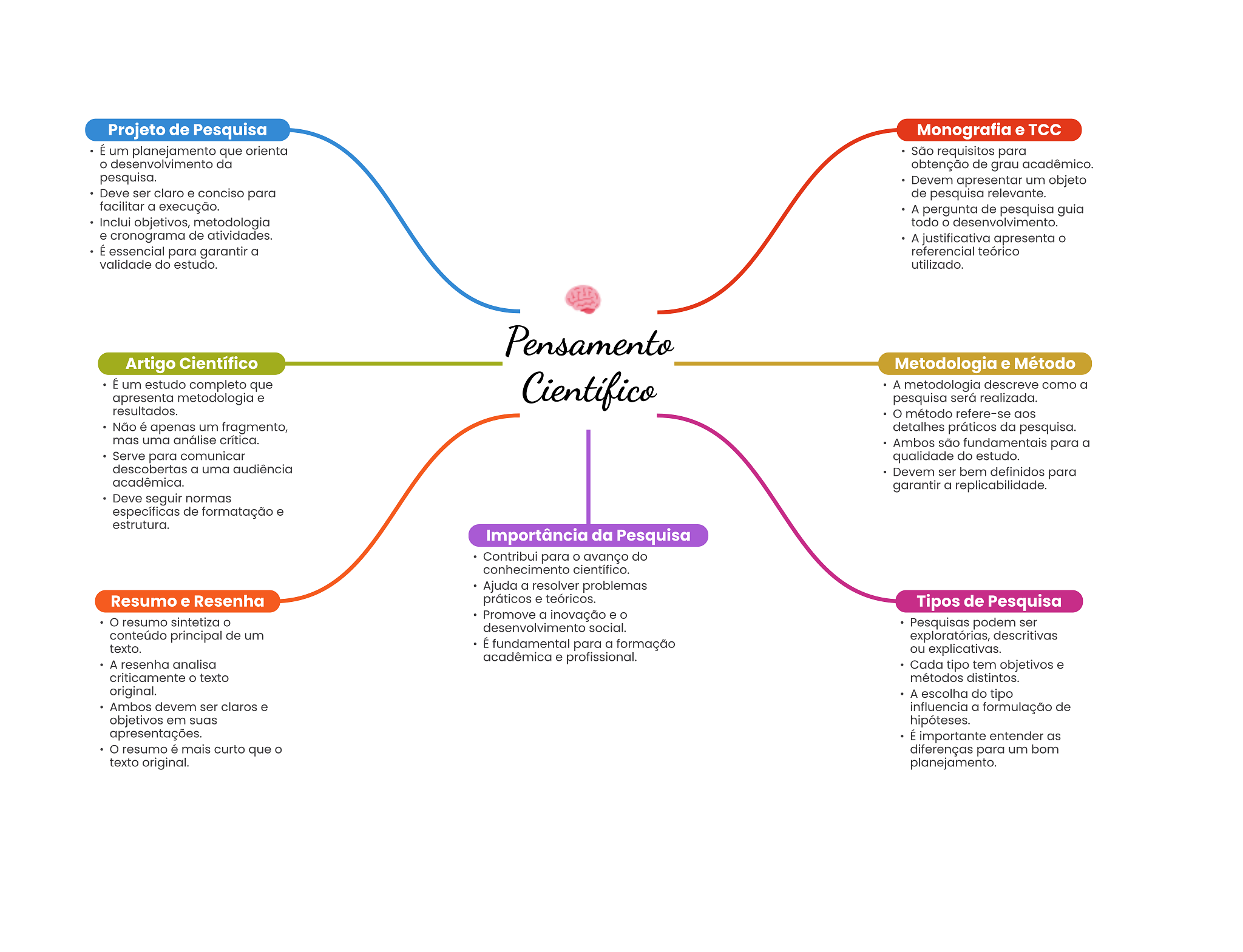 Projeto de Pesquisa Monografia e TCC É um planejamento que orienta São requisitos para da obtenção de grau acadêmico. pesquisa. Devem apresentar um objeto Deve ser claro e conciso para de pesquisa relevante. facilitar a execução. A pergunta de pesquisa guia Inclui objetivos, metodologia todo desenvolvimento. e cronograma de atividades. A justificativa apresenta O É essencial para garantir a referencial teórico validade do estudo. utilizado. Pensamento Artigo Científico Metodologia e Método É um estudo completo que apresenta metodologia e Científico A metodologia descreve como a pesquisa será realizada. resultados. método refere-se aos Não é apenas um fragmento, detalhes práticos da pesquisa. mas uma análise crítica. Ambos são fundamentais para a Serve para comunicar qualidade do estudo. descobertas a uma audiência Devem ser bem definidos para acadêmica. garantir a replicabilidade. Deve seguir normas específicas de formatação e estrutura. Importância da Pesquisa Contribui para avanço do conhecimento científico. Ajuda a resolver problemas Resumo e Resenha práticos e teóricos. Tipos de Pesquisa resumo sintetiza Promove a inovação e O desenvolvimento social. Pesquisas podem ser conteúdo principal de um exploratórias, descritivas texto. É fundamental para a formação ou explicativas. acadêmica e profissional. A resenha analisa Cada tipo tem objetivos e criticamente texto métodos distintos. original. A escolha do tipo Ambos devem ser claros e influencia a formulação de objetivos em suas hipóteses. apresentações. É importante entender as resumo é mais curto que diferenças para um bom texto original. planejamento.