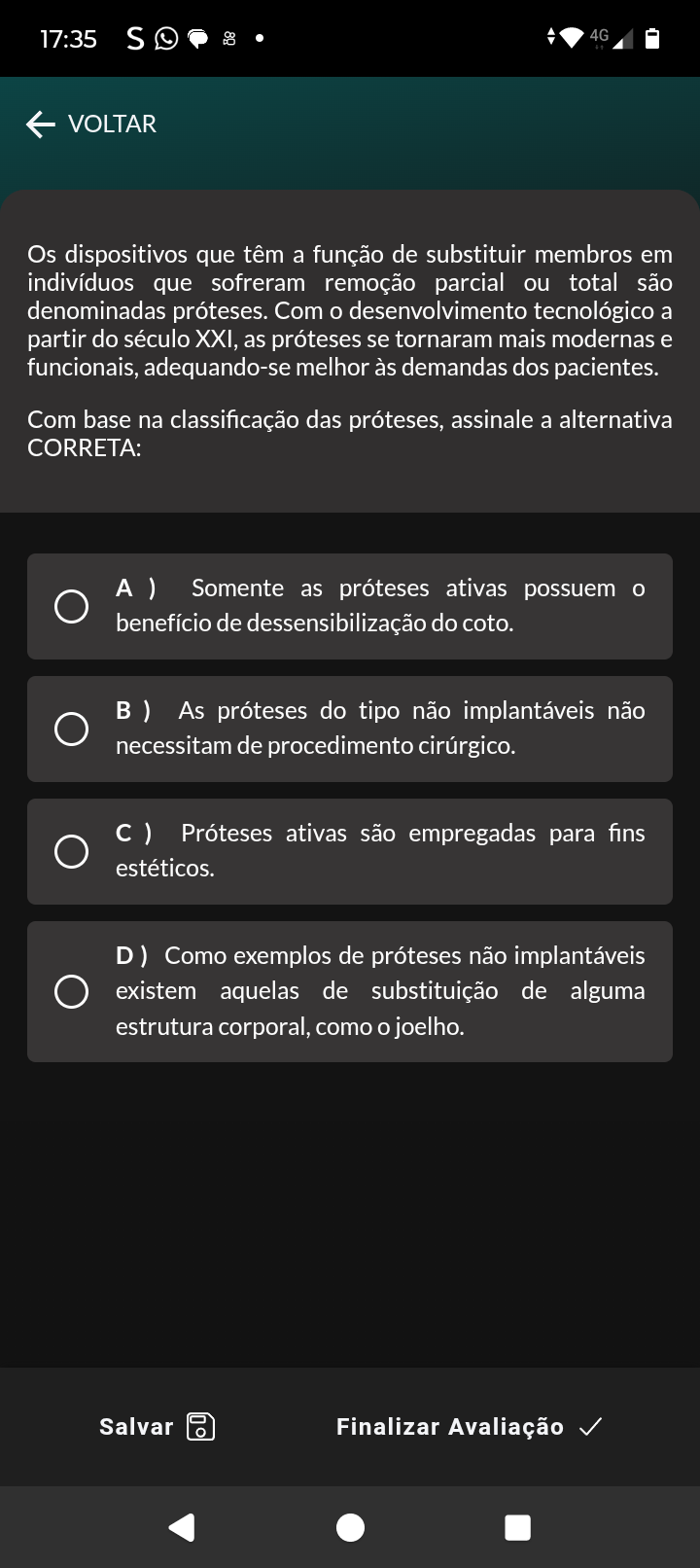 17:35 S 4G VOLTAR Os dispositivos que têm a função de substituir membros em indivíduos que sofreram remoção parcial ou total são denominadas próteses. Com desenvolvimento tecnológico a partir do século XXI, as próteses se tornaram mais modernas e funcionais, adequando-se melhor às demandas dos pacientes. Com base na classificação das próteses, assinale a alternativa CORRETA: A ) Somente as próteses ativas possuem benefício de dessensibilização do coto. B) As próteses do tipo não implantáveis não necessitam de procedimento cirúrgico. Próteses ativas são empregadas para fins estéticos. D) Como exemplos de próteses não implantáveis existem aquelas de substituição de alguma estrutura corporal, como joelho. Salvar Finalizar Avaliação