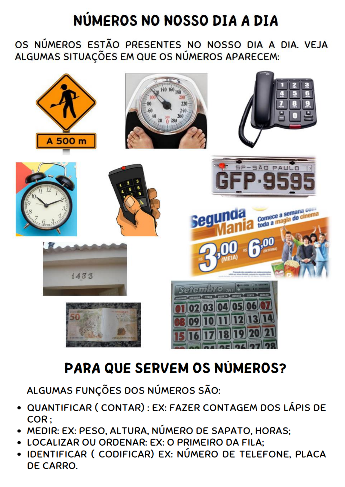 NÚMEROS NO NOSSO DIA A DIA os NÚMEROS ESTÃO PRESENTES NO NOSSO DIA A DIA. VEJA ALGUMAS SITUAÇÕES EM QUE os NÚMEROS APARECEM: 2 140 160 180 100 200 80 220 7 8 9 60 240 40 260 20 0 280 PAULO 2 GFP-9595 12 10 9 3 7 4 6 5 3,00 R$ 6,00 1433 Setembro 2013 01 02 03 04 05 06 07 50 08 09 10 11 12 13 14 15 16 17 18 19 20 21 28 PARA QUE SERVEM os NÚMEROS? ALGUMAS FUNÇÕES DOS NÚMEROS SÃO: QUANTIFICAR (CONTAR) : EX: FAZER CONTAGEM DOS LÁPIS DE COR ; ; MEDIR: EX: PESO, ALTURA, NÚMERO DE SAPATO, HORAS; LOCALIZAR OU ORDENAR: EX: PRIMEIRO DA FILA; IDENTIFICAR ( CODIFICAR) EX: NÚMERO DE TELEFONE, PLACA DE CARRO.