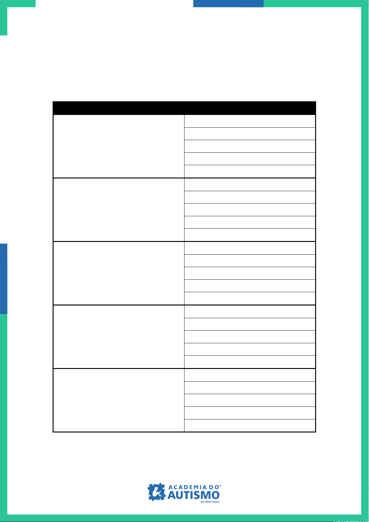 PROC: PROTOCOLO DE OBSERVAÇÃO DO COMPORTAMENTO Aluno: _____________________________________________________ Ano: _______ Comportamento/habilidade Comportamento observado Linguagem expressiva (fala, diálogo, troca de turno, troca ou omissão de fonemas) Funções comunicativas (protesto, interativa, nomeação, informações, narrativa) Forma/meio comunicativo Atenção aos estímulos Tolerância à frustração Manejo de materiais Comportamento inapropriado Noção de término e transição de atividade Troca de turno na atividade Simbolismo Maneirismo ou estereotipia (fala, pensamento ou motor) Interesses e motivadores fortes Potencialidades © 2023 Academia do Autismo Ltda.