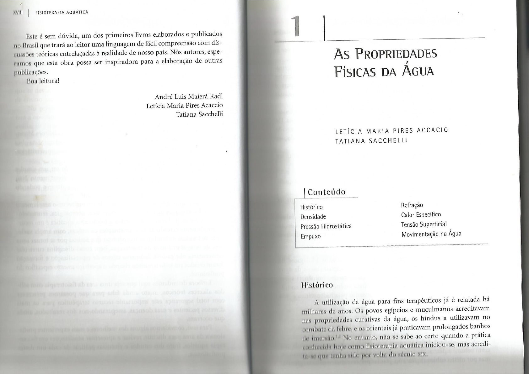 XVIII FISIOTERAPIA AQUÁTICA 1 Este é sem dúvida, um dos primeiros livros elaborados e publicados no Brasil que trará ao leitor uma linguagem de fácil compreensão com dis- cussões teóricas entrelaçadas à realidade de nosso país. Nós autores, espe- As PROPRIEDADES ramos que esta obra possa ser inspiradora para a elaboração de outras publicações. FÍSICAS DA ÁGUA Boa leitura! André Luis Maierá Radl Letícia Maria Pires Acaccio Tatiana Sacchelli LETÍCIA MARIA PIRES ACCACIO TATIANA SACCHELLI Conteúdo Histórico Refração Densidade Calor Específico Pressão Hidrostática Tensão Superficial Empuxo Movimentação na Água Histórico A utilização da água para fins terapêuticos já é relatada há milhares de anos. Os povos egípcios e muçulmanos acreditavam nas propriedades curativas da água, os hindus a utilizavam no combate da febre, e os orientais já praticavam prolongados banhos de No entanto, não se sabe ao certo quando a prática conhecida hoje como fisioterapia aquática iniciou-se, mas acredi- la que tenha sido por volta do século2 FISIOTERAPIA AQUÁTICA AS PROPRIEDADES FÍSICAS DA ÁGUA 3 Em 1830, época na qual apareceram os primeiros spas nos Estados m (kg) Unidos, Vincent Priessnitz iniciou o trabalho com os primeiros exercícios d V (m³) no meio aquático visando à terapêutica e pesquisou pela primeira vez as reações do organismo em diferentes temperaturas da água. Como podemos observar pela fórmula, a densidade depende tanto da Cerca de cem anos depois, Lowman publicou Techinique of Underwa- massa de um objeto como também do volume que aquela massa ocupa. Por ter Gymnastics: a Study in Practical Application, no qual detalhou métodos exemplo, se considerarmos 1 kg de chumbo e 1 kg de algodão, podemos per- terapêuticos utilizados em piscina, destacando dosagem, freqüência e que o volume ocupado pelo algodão será muito maior do que o volu- duração dos exercícios. Essa foi uma das primeiras publicações americanas me ocupado pela mesma massa de chumbo; pois eles apresentam densida- a respeito de exercícios terapêuticos na água.³ des bastante diferentes, o chumbo é muito mais denso do que o algodão. No Atualmente, apesar do número de publicações ter aumentado, poucas quadro a seguir estão apresentadas as densidades de alguns materiais: apresentam resultados conclusivos sobre os benefícios da hidroterapia. De qualquer maneira, sabe-se que a prática de exercícios em água aquecida promove diminuição da dor e da sobrecarga de peso nas articulações QUADRO 1.1 DENSIDADES. durante a execução de exercícios de reabilitação.⁴ Recentemente, alguns autores demonstraram a fisioterapia aquática ser MATERIAIS DENSIDADE (G/CM³) benéfica: Agua pura (4°C) 1,00 Agua pura (0°C gelo) 0,92 no tratamento de pacientes com fibromialgia, melhorando a quali- Agua do mar (10°C e 3,3% salinidade) 1,03 dade de vida e a satisfação do 0,001 em pacientes com artrite reumatóide, atuando principalmente na Corpo humano (média) 0,97 musculatura das Massa magra (ossos e músculos) 1,10 em pacientes com espasticidade, geralmente relacionada à paralisia adiposo 0,90 cerebral, como uma terapia complementar que possibilita a redução na administração de medicamentos orais, que apresentam diversos efeitos colaterais.⁸ Considerando a densidade da água, podemos estabelecer a gravidade No entanto, para entendermos melhor os efeitos biológicos da (densidade específica) de outras substâncias, definida pela razão: imersão na reabilitação, é necessário alguns princípios físicos da água densidade desta substância serem compreendidos. Cada propriedade física possui influência sobre Gravidade específica = o corpo humano, podendo ser utilizada direta ou indiretamente no tra- densidade da água tamento aquático por meio de efeitos causados pela hidrostática e pela hidrodinâmica. Pela gravidade específica podemos saber se determinado corpo flutua- afundará quando imerso em água. Assim, substâncias com densida- inferiores a da água flutuarão. Densidade Como visto no Quadro 1.1, o corpo humano apresenta gravidade rela- de cerca de 0,97, variável ao longo da vida em razão do tecido adipo- A densidade é definida como a quantidade de massa ocupada por geralmente encontrado em maior quantidade em bebês e idosos, que certo volume a determinada temperatura e pode ser expressa em quilogra- apresenta densidade próxima de 0,9; enquanto tecidos magros, como mús- mas por metro cúbico ou gramas por centimetro cúbico apresentam densidade de aproximadamente4 FISIOTERAPIA AQUÁTICA AS PROPRIEDADES FÍSICAS DA ÁGUA 5 A densidade de cada parte do corpo humano também é variável: por Empuxo exemplo, os membros superiores flutuam mais facilmente do que os infe- riores por apresentarem menor densidade.¹¹ fato dos corpos imersos apresentarem peso aparente inferior ao Existem certas deficiências, como a paraplegia, nas quais estas densi- no solo é em razão de uma força denominada empuxo ou flu- dades apresentam-se alteradas e devem, portanto, ser levadas em conside- de direção igual, porém contrária à força da gravidade, provocada ração durante o tratamento de fisioterapia aquática.¹² pelo volume do líquido deslocado na imersão. A força de flutuação é igual peso do volume deslocado e, por isso, gera a sensação dos objetos serem mais leves na água. É a força do empuxo que garante a diminuição de Pressão Hidrostática nos exercícios executados na água. A pressão é definida pela força aplicada em uma determinada área e E=m.g=d.V.g pode ser expressa em Newtons por metro quadrado unidade conhecida também como Pa (Pascal), ou milímetros de mercúrio (mmHg). que g (gravidade) = 9,81 m/s²; E = empuxo; m = massa do objeto; d = densidade da água; V = volume do objeto que está submerso (volume do (N) P (Pa) fluido deslocado). Durante a execução de movimentos na água, pode-se A (m²) utilizar a flutuação