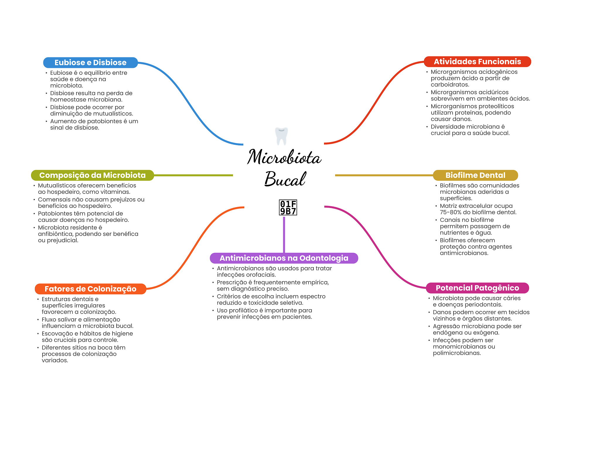 Eubiose e Disbiose Atividades Funcionais Eubiose é equilíbrio entre Microrganismos acidogênicos saúde e doença na produzem ácido a partir de microbiota. carboidratos. Disbiose resulta na perda de Microrganismos acidúricos homeostase microbiana. sobrevivem em ambientes ácidos. Disbiose pode ocorrer por Microrganismos proteolíticos diminuição de mutualísticos. utilizam proteínas, podendo Aumento de patobiontes é um causar danos. sinal de disbiose. Diversidade microbiana é crucial para a saúde bucal. Microbiota Composição da Microbiota Bucal Biofilme Dental Mutualísticos oferecem benefícios Biofilmes são comunidades ao hospedeiro, como vitaminas. microbianas aderidas a Comensais não causam prejuízos ou superfícies. benefícios ao hospedeiro. 01F Matriz extracelular ocupa Patobiontes têm potencial de 9B7 75-80% do biofilme dental. causar doenças no hospedeiro. Canais no biofilme Microbiota residente é permitem passagem de anfibiôntica, podendo ser benéfica nutrientes e água. ou prejudicial. Biofilmes oferecem proteção contra agentes antimicrobianos. Antimicrobianos na Odontologia Antimicrobianos são usados para tratar infecções orofaciais. Prescrição é frequentemente empírica, Fatores de Colonização sem diagnóstico preciso. Potencial Patogênico Estruturas dentais e Critérios de escolha incluem espectro Microbiota pode causar cáries reduzido e toxicidade seletiva. superfícies irregulares e doenças periodontais. favorecem a colonização. Uso profilático é importante para Danos podem ocorrer em tecidos Fluxo salivar e alimentação prevenir infecções em pacientes. vizinhos e órgãos distantes. influenciam a microbiota bucal. Agressão microbiana pode ser Escovação e hábitos de higiene endógena ou exógena. são cruciais para controle. Infecções podem ser Diferentes sítios na boca têm monomicrobianas ou processos de colonização polimicrobianas. variados.