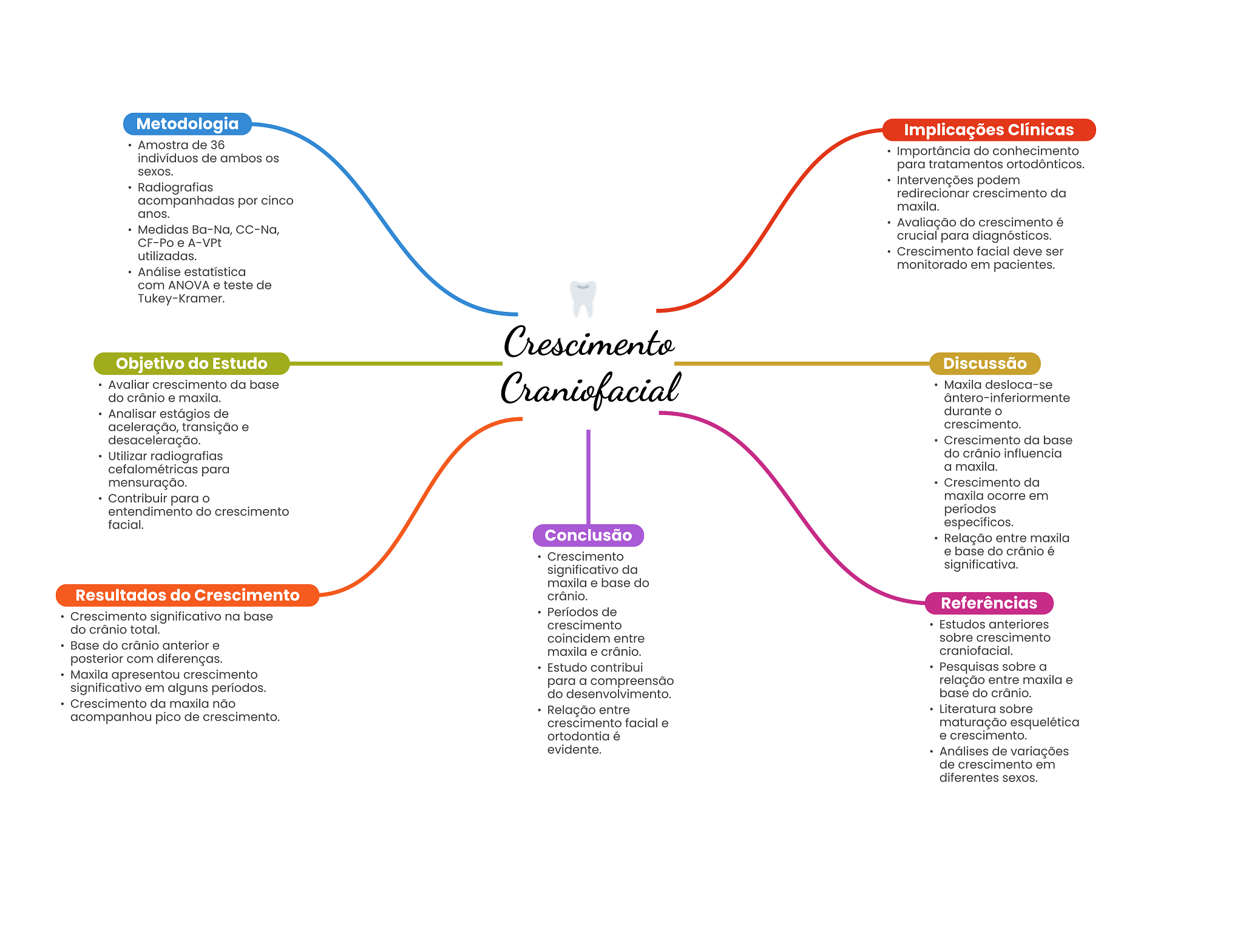 Metodologia Implicações Clínicas Amostra de 36 indivíduos de ambos OS Importância do conhecimento para tratamentos ortodônticos. sexos. Radiografias Intervenções podem redirecionar crescimento da acompanhadas por cinco maxila. anos. Medidas Ba-Na, CC-Na, Avaliação do crescimento é CF-Po e A-VPt crucial para diagnósticos. utilizadas. Crescimento facial deve ser Análise estatística monitorado em pacientes. com ANOVA e teste de Tukey-Kramer. Crescimento Objetivo do Estudo Discussão Avaliar crescimento da base Craniofacial Maxila desloca-se do crânio e maxila. ântero-inferiormente Analisar estágios de durante aceleração, transição e crescimento. desaceleração. Crescimento da base Utilizar radiografias do crânio influencia cefalométricas para a maxila. mensuração. Crescimento da Contribuir para maxila ocorre em entendimento do crescimento períodos facial. específicos. Conclusão Relação entre maxila Crescimento e base do crânio é significativo da significativa. maxila e base do Resultados do Crescimento crânio. Referências Crescimento significativo na base Períodos de do crânio total. crescimento Estudos anteriores coincidem entre sobre crescimento Base do crânio anterior e maxila e crânio. craniofacial. posterior com diferenças. Estudo contribui Pesquisas sobre a Maxila apresentou crescimento para a compreensão relação entre maxila e significativo em alguns períodos. do desenvolvimento. base do crânio. Crescimento da maxila não acompanhou pico de crescimento. Relação entre Literatura sobre crescimento facial e maturação esquelética ortodontia é e crescimento. evidente. Análises de variações de crescimento em diferentes sexos.
