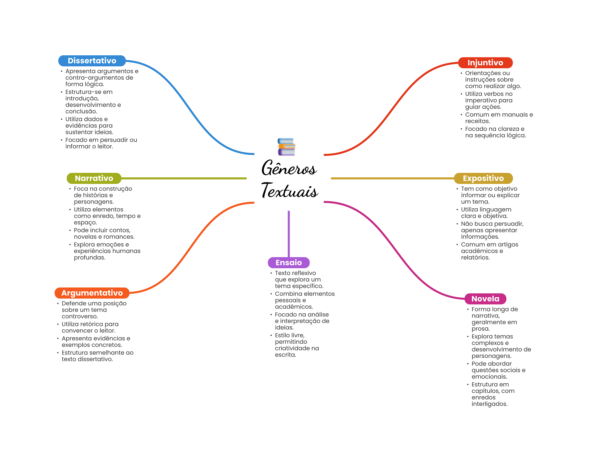 Dissertativo Injuntivo Apresenta argumentos e Orientações ou contra-argumentos de instruções sobre forma lógica. como realizar algo. Estrutura-se em Utiliza verbos no introdução, imperativo para desenvolvimento e guiar ações. conclusão. Comum em manuais e Utiliza dados e receitas. evidências para Focado na clareza e sustentar ideias. na sequência lógica. Focado em persuadir ou informar O leitor. Gêneros Narrativo Expositivo Foca na construção Textuais Tem como objetivo de histórias e informar ou explicar personagens. um tema. Utiliza elementos Utiliza linguagem como enredo, tempo e clara e objetiva. espaço. Não busca persuadir, Pode incluir contos, apenas apresentar novelas e romances. informações. Explora emoções e Comum em artigos experiências humanas acadêmicos e profundas. relatórios. Ensaio Texto reflexivo que explora um tema específico. Argumentativo Combina elementos pessoais e Novela Defende uma posição acadêmicos. sobre um tema Forma longa de controverso. Focado na análise narrativa, Utiliza retórica para e interpretação de geralmente em ideias. convencer leitor. prosa. Apresenta evidências e Estilo livre, Explora temas exemplos concretos. permitindo complexos e criatividade na desenvolvimento de Estrutura semelhante ao escrita. texto dissertativo. personagens. Pode abordar questões sociais e emocionais. Estrutura em capítulos, com enredos interligados.