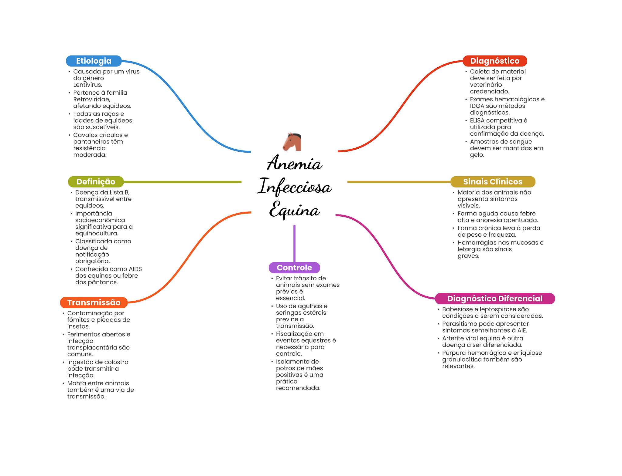 Etiologia Diagnóstico Causada por um vírus Coleta de material do gênero deve ser feita por Lentivírus. veterinário Pertence à família credenciado. Retroviridae, Exames hematológicos e afetando equídeos. IDGA são métodos Todas as raças e diagnósticos. idades de equídeos ELISA competitiva é são suscetíveis. utilizada para Cavalos crioulos e confirmação da doença. pantaneiros têm Amostras de sangue resistência devem ser mantidas em moderada. gelo. Anemia Definição Infecciosa Sinais Clínicos Doença da Lista B, Maioria dos animais não transmissível entre apresenta sintomas equídeos. Importância Equina visíveis. Forma aguda causa febre socioeconômica alta e anorexia acentuada. significativa para a Forma crônica leva à perda equinocultura. de peso e fraqueza. Classificada como Hemorragias nas mucosas e doença de letargia são notificação graves. obrigatória. Conhecida como AIDS Controle dos equinos ou febre Evitar trânsito de dos pântanos. animais sem exames prévios é essencial. Transmissão Diagnóstico Diferencial Uso de agulhas e Contaminação por seringas estéreis Babesiose e leptospirose são fômites e picadas de previne a condições a serem consideradas. insetos. transmissão. Parasitismo pode apresentar sintomas semelhantes à AIE. Ferimentos abertos e Fiscalização em infecção eventos equestres é Arterite viral equina é outra transplacentária são necessária para doença a ser diferenciada. comuns. controle. Púrpura hemorrágica e erliquiose Ingestão de colostro Isolamento de granulocítica também são pode transmitir a potros de mães relevantes. infecção. positivas é uma Monta entre animais prática também é uma via de recomendada. transmissão.