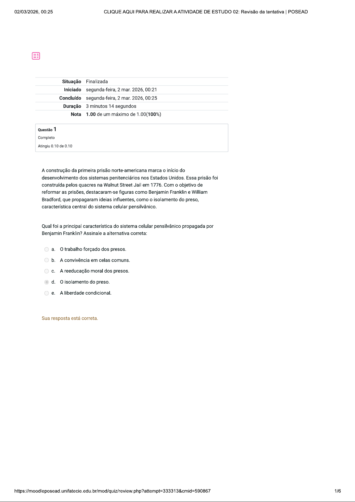 02/03/2026, 00:25 CLIQUE AQUI PARA REALIZAR AATIVIDADE DE ESTUDO 02: Revisão da tentativa POSEAD Situação Finalizada Iniciado segunda-feira, 2 mar. 2026, 00:21 Concluído segunda-feira, 2 mar. 2026, 00:25 Duração 3 minutos 14 segundos Nota 1.00 de um máximo de 1.00(100%) Questão 1 Completo Atingiu 0.10 de 0.10 A construção da primeira prisão norte-americana marca o início do desenvolvimento dos sistemas penitenciários nos Estados Unidos. Essa prisão foi construída pelos quacres na Walnut Street Jail em 1776. Com o objetivo de reformar as prisões, destacaram-se figuras como Benjamin Franklin e William Bradford, que propagaram ideias influentes, como o isolamento do preso, característica central do sistema celular pensilvânico. Qual foi a principal característica do sistema celular pensilvânico propagada por Benjamin Franklin? Assinale a alternativa correta: a. trabalho forçado dos presos. b. A convivência em celas comuns. A reeducação moral dos presos. d. isolamento do preso. e. A liberdade condicional. Sua resposta está correta. 1/602/03/2026, 00:25 CLIQUE AQUI PARA REALIZAR AATIVIDADE DE ESTUDO 02: Revisão da tentativa POSEAD Questão 2 Completo Atingiu 0.10 de 0.10 A medida de segurança, apesar de seu caráter terapêutico, é considerada por alguns autores como uma forma de sanção penal, devido à privação de liberdade que ela impõe. legislação penal brasileira prevê duas formas de medidas de segurança: detentiva e restritiva, cada qual aplicada conforme a gravidade do delito e a necessidade de tratamento do agente. Quais são as espécies de medidas de segurança previstas no Código Penal brasileiro e as condições para sua aplicação? Assinale a alternativa correta: a. Medidas educativas e prestação de serviços à comunidade, aplicadas a jovens infratores. b. Internação em hospital de custódia e tratamento psiquiátrico, e sujeição a tratamento ambulatorial, aplicadas conforme a pena prevista e a periculosidade do agente. Internação em hospital de custódia e tratamento psiquiátrico, sujeição a tratamento ambulatorial, aplicadas conforme a gravidade do crime. d. Prisão domiciliar e monitoramento eletrônico, aplicadas a crimes de menor potencial ofensivo. e. Internação em hospital psiquiátrico e liberdade condicional, aplicadas a crimes hediondos. Sua resposta está correta. Questão 3 Completo Atingiu 0.10 de 0.10 A teoria relativa ou preventiva da pena busca justificar a aplicação das penas no sistema penal com o objetivo de prevenir futuros crimes e proteger a sociedade. Diferente da teoria absoluta, que foca na retribuição do mal causado pelo crime, a teoria relativa tem um enfoque utilitário e pragmático. Sendo assim, responda à questão abaixo relativa ao tema apresentado. Qual é a principal diferença entre a teoria absoluta e a teoria relativa da pena? Assinale a alternativa correta: a. A teoria absoluta busca prevenir futuros crimes e proteger a sociedade. b. teoria absoluta se concentra na reabilitação do delinquente. C. A teoria relativa e a teoria absoluta têm o mesmo objetivo. d. A teoria relativa foca na prevenção de futuros crimes e na proteção da sociedade, enquanto a teoria absoluta se concentra na retribuição do mal causado pelo crime. e. A teoria relativa foca exclusivamente na retribuição do mal causado pelo crime. Sua resposta está correta. 2/602/03/2026, 00:25 CLIQUE AQUI PARA REALIZAR AATIVIDADE DE ESTUDO 02: Revisão da tentativa POSEAD Questão 4 Completo Atingiu 0.10 de 0.10 No contexto das medidas de segurança, existe uma distinção fundamental entre inimputáveis e semi-imputáveis. Inimputáveis são aqueles que, devido a um problema mental, não possuem capacidade de entender o caráter ilícito do ato ou de agir conforme esse entendimento. Por outro lado, semi-imputáveis possuem essa capacidade reduzida. 0 sistema penal brasileiro adota o sistema vicariante, que permite a aplicação de uma única sanção: pena ou medida de segurança, conforme a periculosidade do agente. Com base no exposto, qual é o sistema penal atualmente adotado no Brasil para a aplicação de medidas de segurança, e como ele opera? Assinale a alternativa correta: a. Sistema alternativo, permitindo ao réu escolher entre pena e medida de segurança. b. Sistema híbrido, permitindo a aplicação de pena com supervisão terapêutica. Sistema do duplo binário, permitindo a aplicação cumulativa de pena e medida de segurança. d. Sistema vicariante, permitindo a aplicação de pena ou medida de segurança, mas nunca ambas. e. Sistema cumulativo, aplicando penas e medidas de segurança simultaneamente para semi-imputáveis. Sua resposta está correta. 3/602/03/2026, 00:25 CLIQUE AQUI PARA REALIZAR AATIVIDADE DE ESTUDO 02: Revisão da tentativa POSEAD Questão 5 Completo Atingiu 0.10 de 0.10 Alternativas à prisão são medidas penais que buscam substituir ou complementar a pena privativa de liberdade, visando reduzir a população carcerária e promover formas mais eficazes de reabilitação e reintegração dos condenados na sociedade. Entre as principais alternativas, destaca-se a prestação de serviços à comunidade, liberdade condicional, suspensão condicional da pena, monitoramento eletrônico e tratamento psicológico e psiquiátrico. Essas medidas são especialmente importantes em contextos de superlotação carcerária e têm o potencial de reduzir a reincidência criminal ao focar na reabilitação. Com base no texto acima, identifique qual das opções abaixo É uma alternativa à prisão mencionada no texto. Assinale a alternativa correta: a. Pena de Morte. b. Multa Pecuniária. Prisão Temporária. d. Prestação de Serviços à Comunidade. e. Reclusão em Regime Fechado. Sua resposta está correta. Questão 6 Completo Atingiu 0.10 de 0.10 Dentro da teoria relativa ou preventiva da pena, existem subdivisões que visam diferentes aspectos da prevenção. A prevenção geral busca desestimul