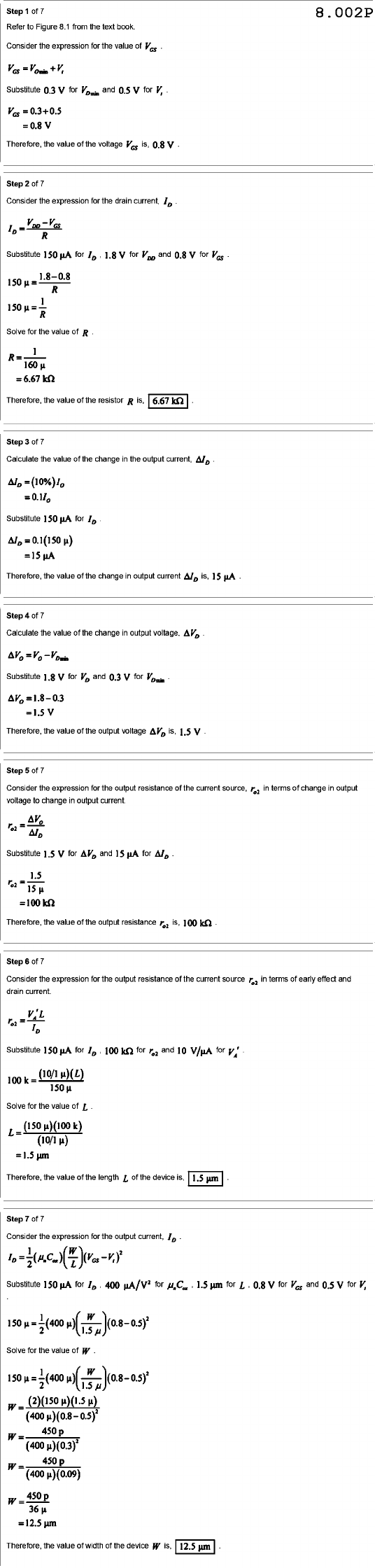 Step of 7 8.002P Refer to Figure 8.1 from the text book. Consider the expression for the value of Substitute 0.3 V for and 0.5 V for 0.8 V Therefore, the value of the voltage is, 0.8 V Step of 7 Consider the expression for the drain current, R Substitute 150 for 1.8 V for and 0.8 V for 1.8-0.8 150 R 1 150 = R Solve for the value of R 1 R 160 Therefore, the value of the resistor R is, Step Calculate the value of the change in the output current, Substitute 150 for Therefore, the value of the change in output current is, 15 Step of 7 Calculate the value of the change in output voltage, Substitute 1.8 V for and 0.3 V for =1.5 V Therefore, the value of the output voltage is, 1.5 V Step of Consider the expression for the output resistance of the current source, in terms of change in output voltage to change in output Substitute 1.5 V for and 15 for 1.5 = 100 Therefore, the value of the output resistance is, 100 Step of Consider the expression for the output resistance of the current source in terms of early effect and drain current. Substitute 150 for 100 for and 10 V/µA for 100 Solve for the value of L L 1.5 Therefore, the value of the length L of the device is, 1.5 Step of 7 Consider the expression for the output current, Substitute 150 for 400 for 1.5 µm for L 0.8 V for and 0.5 V for V, Solve for the value of W W W 450 W W 12.5 um Therefore, the value of width of the device W is, 12.5