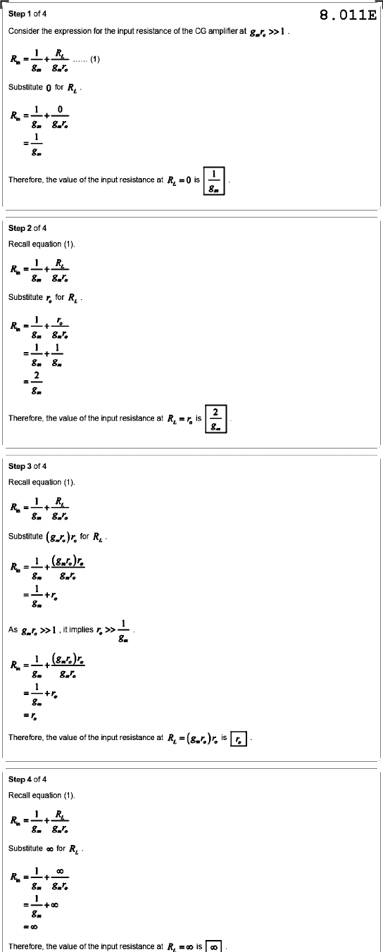 Step 1 of 4 8.011E Consider the expression for the input resistance of the CG amplifier at » 1. = I + (1) 8m Substitute 0 for = 1 + 0 1 = 1 Therefore, the value of the input resistance at = 0 is 8m Step 2 of 4 Recall equation (1). Rin = I + 8m Substitute for Rin = + = + 1 8m 8m 2 = 8m 2 Therefore, the value of the input resistance at = is 8m Step 3 of 4 Recall equation (1). Rin = + Substitute for = 1 + 8m = 8m 1 As » it implies » Rin = 1 + 8m = 8m 1 = Therefore, the value of the input resistance at = is Step 4 of 4 Recall equation (1). = + Substitute for = + = 8m Therefore, the value of the input resistance at = 8 is 8