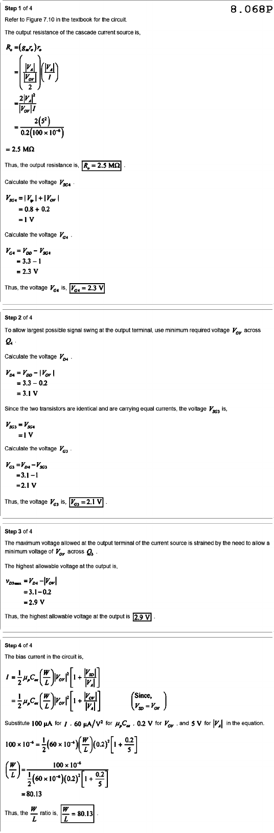 Step of 4 8.068P Refer to Figure 7.10 in the textbook for the circuit. The output resistance of the cascade current source is, = = = = 2.5 MΩ Thus, the output resistance is, MΩ Calculate the voltage = V Calculate the voltage = 3.3 = 2.3 V Thus, the voltage is, Step of 4 To allow largest possible signal swing at the output terminal, use minimum required voltage across Calculate the voltage = 3.3 0.2 = 3.1 V Since the two transistors are identical and are carrying equal currents, the voltage is, = V Calculate the voltage =3.1-1 =2.1 V Thus, the voltage is, Step of 4 The maximum voltage allowed at the output terminal of the current source is strained by the need to allow a minimum voltage of across The highest allowable voltage at the output is, =3.1-0.2 =2.9 V Thus, the highest allowable voltage at the output is 2.9 V Step of 4 The bias current in the circuit is, Since, = ) Substitute 100 µA for I 60 for 0.2 V for and 5 V for in the equation. 100 0.2 5 =80.13 W W Thus, the ratio is, 80.13 L L