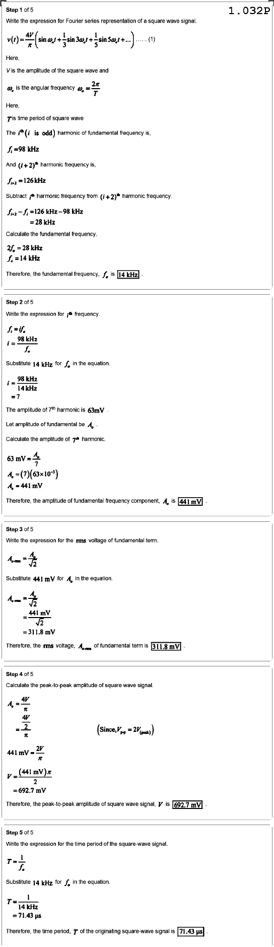 Step of 5 1.032P Write the expression for Fourier series representation of a square wave signal. (1) Here, Vis the amplitude of the square wave and is the angular frequency Here, time period of square wave The ith is odd) harmonic of fundamental frequency is, =98 kHz And (i+2)* harmonic frequency is, =126kHz Subtract harmonic frequency from (i+2)* harmonic frequency. = 28 kHz Calculate the fundamental frequency. 28 kHz Therefore, the fundamental frequency, is Step of 5 Write the expression for frequency. 98 kHz Substitute 14 kHz for in the equation. i 98 kHz 14 kHz =7 The amplitude of 7th harmonic is 63mV Let amplitude of fundamental be Calculate the amplitude of harmonic. 63 mV = 7 441 mV Therefore, the amplitude of fundamental frequency component, A. is Step of 5 Write the expression for the rms voltage of fundamental term. Substitute 441 mV for A. in the equation. = 441 mV = = 311.8 mV Therefore, the rms voltage, of fundamental term is 311.8 mV 311.8 Step of 5 Calculate the peak-to-peak amplitude of square wave signal. 4V 441 mV V = mV)π 2 Therefore, the peak-to-peak amplitude of square wave signal, V is 692.7 mV Step of 5 Write the expression for the time period of the square-wave signal. T Substitute 14 kHz for in the equation. T 1 14 kHz 71.43 Therefore, the time period, T of the originating square-wave signal is