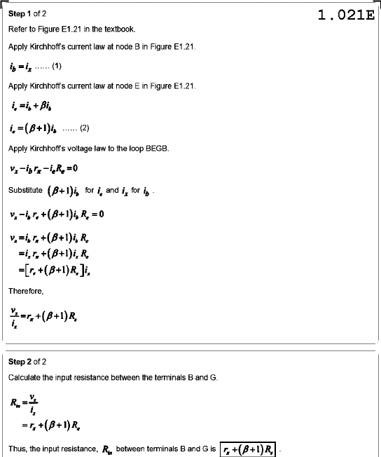 Step 1 of 2 1.021E Refer to Figure E1.21 in the textbook. Apply Kirchhoff's current law at node B in Figure E1.21. ib=ix (1) Apply Kirchhoff's current law at node E in Figure E1.21. ...... (2) Apply Kirchhoff's voltage law to the loop BEGB. Substitute for and ix for if Therefore, Step 2 of 2 Calculate the input resistance between the terminals B and G. Thus, the input resistance, between terminals B and G is