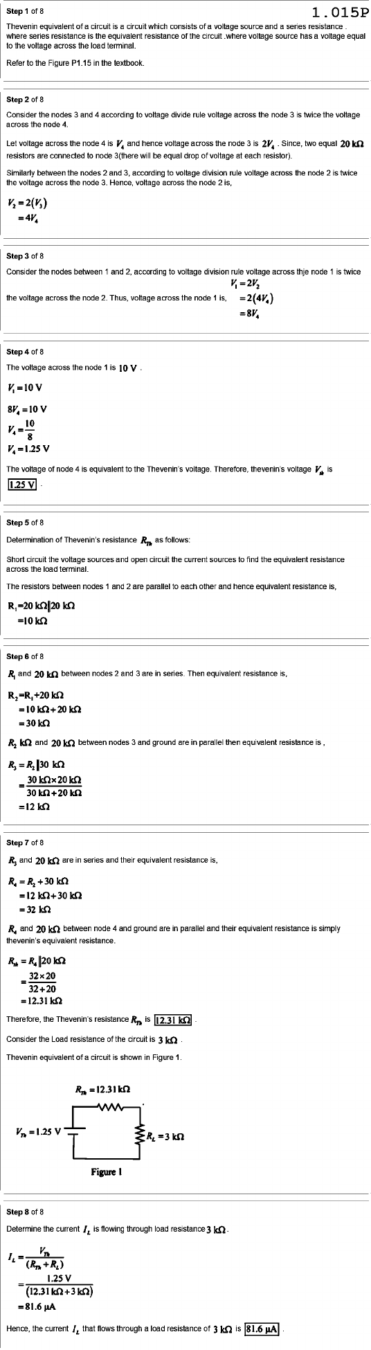 Step of 8 1.015P Thevenin equivalent of a circuit is a circuit which consists of a voltage source and a series resistance where series resistance is the equivalent resistance of the circuit where voltage source has a voltage equal to the voltage across the load terminal. Refer to the Figure P1.15 in the textbook. Step of 8 Consider the nodes 3 and 4 according to voltage divide rule voltage across the node 3 is twice the voltage across the node 4. Let voltage across the node 4 is and hence voltage across the node 3 is Since, two equal resistors are connected to node 3(there will be equal drop of voltage at each resistor). Similarly between the nodes 2 and 3, according to voltage division rule voltage across the node 2 is twice the voltage across the node 3. Hence, voltage across the node 2 is, Step of 8 Consider the nodes between 1 and 2, according to voltage division rule voltage across thje node 1 is twice the voltage across the node 2. Thus, voltage across the node 1 is, = Step of 8 The voltage across the node 1 is 10 10 8 The voltage of node 4 is equivalent to the Thevenin's voltage. Therefore, thevenin's voltage is 1.25 V Step of 8 Determination of Thevenin's resistance as follows: Short circuit the voltage sources and open circuit the current sources to find the equivalent resistance across the load terminal. The resistors between nodes 1 and 2 are parallel to each other and hence equivalent resistance is, Step of 8 and 20 kΩ between nodes 2 and 3 are in series. Then equivalent resistance is, R2 kΩ and 20 kΩ between nodes 3 and ground are in parallel then equivalent resistance is = Step of 8 R3 and 20 kΩ are in series and their equivalent resistance is, 32 kΩ and 20 kΩ between node 4 and ground are in parallel and their equivalent resistance is simply thevenin's equivalent resistance. 32x20 = 32+20 Therefore, the Thevenin's resistance is Consider the Load resistance of the circuit is 3 kΩ Thevenin equivalent of a circuit is shown in Figure 1. Figure Step of 8 Determine the current is flowing through load resistance 3 kΩ. 1.25 V II Hence, the current that flows through a load resistance of 3 is