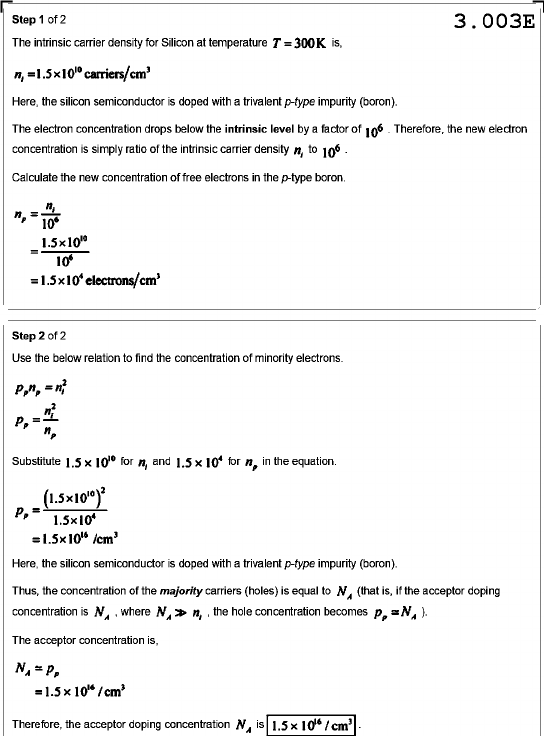 Step 1 of 2 3.003E The intrinsic carrier density for Silicon at temperature T = 300K is, Here, the silicon semiconductor is doped with a trivalent p-type impurity (boron). The electron concentration drops below the intrinsic level by a factor of 10⁶ Therefore, the new electron concentration is simply ratio of the intrinsic carrier density n, to Calculate the new concentration of free electrons in the p-type boron. electrons/cm3 Step 2 of 2 Use the below relation to find the concentration of minority electrons. Substitute 1.5 for n, and for in the equation. = Here, the silicon semiconductor is doped with a trivalent p-type impurity (boron). Thus, the concentration of the majority carriers (holes) is equal to N, (that is, if the acceptor doping concentration is , where N, n, the hole concentration becomes = The acceptor concentration is, It Therefore, the acceptor doping concentration is