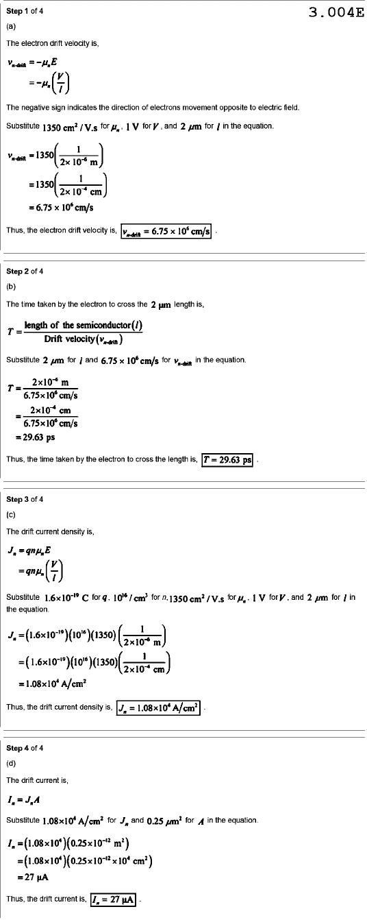 Step 1 of 4 3.004E (a) The electron drift velocity is, = = The negative sign indicates the direction of electrons movement opposite to electric field. Substitute 1350 / V.s for 1 V for and 2 µm for in the equation. 1350 = 1350 = 6.75 cm/s Thus, the electron drift velocity is, Step 2 of 4 (b) The time taken by the electron to cross the 2 length is, length of the T = Drift Substitute 2 µm for / and 6.75 10⁶ cm/s for in the equation. T = m = cm = 29.63 ps Thus, the time taken by the electron to cross the length is, - Step 3 of 4 (c) The drift current density is, = Substitute 1.6x10⁻¹⁹ C for / for n, 1350 / V.s for 1 V for and 2 µm for in the equation. Thus, the drift current density is, Step 4 of 4 (d) The drift current is, = Substitute for and 0.25 µm² for A in the equation. = 27 Thus, the drift current is,
