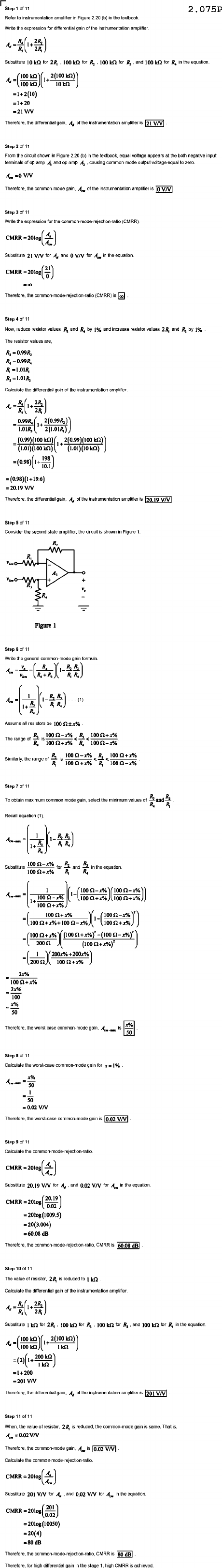 Step 1 of 11 2.075P Refer instrumentation Figure Write expression for differer instr Substitute 2R, R2 and for =1+2(10) =1+20 Therefore the differential gain, amplifier Step 2 of 11 From shown Figure 2.20 the textbook equal voltage appears the input terminals amp and op amp causing com mon mode output voltage equal the common mode gain, instrumentation amplifier 0 V/V Step 3 of 11 expression (CMRR) CMRR Substitute 21 V/V for V/V for in the equation CMRR rejection -ratic Step reduce resistor values and by 1% increase resistor values 2R, and 1% The resistor values are, Calculate differential of the instrumentation amplifier 1.01R, 198 =(0.98)(1+19.6) Therefore 20.19 V/V Step 5 of 11 Consider state amplifier shown Figure 1. Figure Step 6 of 11 formula (1) Assume al resistors R, The range of the range of Step 7 of 11 R2 To obtain maximum common mode gain select R2 R1 Substitute and in the equation 2x% 2x% 100 50 x% Therefore the worst case common-mode gain, 50 Step 8 of 11 Calculate worst-case common-mode gain for x=1% 50 - 50 =0.02 V/V Therefore case mode gams 0.02 V/V Step 9 of 11 Calculate rejection-ratio CMRR Substitute V/V and 0.02 V/V equation CMRR 0.02 dB mode ratio, Step 10 of 11 The value resistor, 2R, Calculate the differential gain the umentation amplifier Substitute for 2R, and R, =1+200 Therefore the of the 201 V/V Step 11 of 11 the common- mode same Therefore the mode gain, 0.02 V/V Calculate common-mode rejection Substitute 201 V/V and 0.02 V/V for in the equation 201 0.02 =20(4) =80 dB Therefore the common rejection -ratio CMRR is 80 dB for high differential gain high CMRR achieved