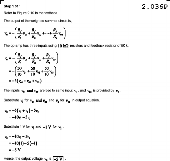 Step 1 of 1 2.036P Refer to Figure 2.10 in the textbook. The output of the weighted summer circuit is, The op-amp has three inputs using 10 kΩ resistors and feedback resistor of 50 k. The inputs and are tied to same input and is provided by Substitute for and and for in output equation. Substitute 1 V for and for =-10(1)-5(-1) =-5V Hence, the output voltage is -5V
