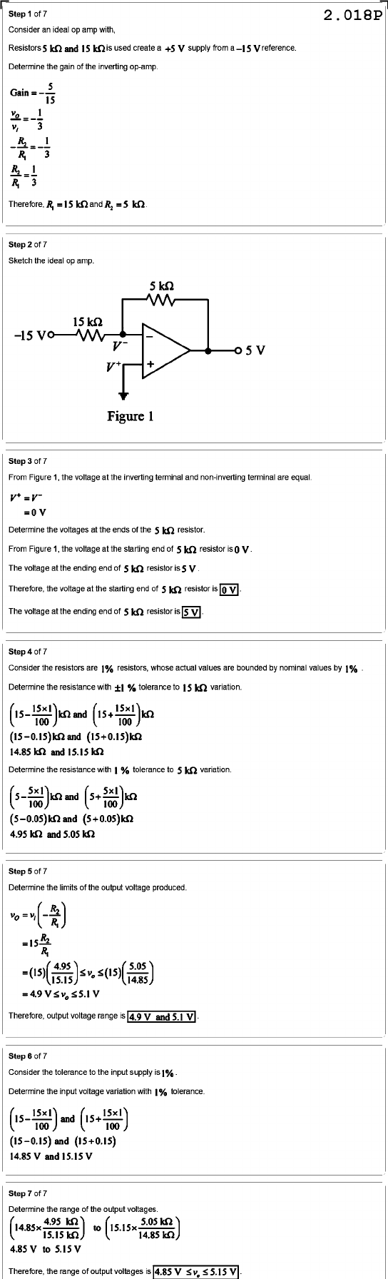 Step of 7 2.018P Consider an ideal op amp with, Resistors 5 kΩ and 15 kΩ is used create a +5 V supply from a -15 V reference. Determine the gain of the inverting op-amp. 5 Gain 15 v, 3 3 Therefore, = 15 kΩ and = 5 kΩ Step of 7 Sketch the ideal op amp. 5 kΩ 15 kΩ -15 5 V + Figure 1 Step of 7 From Figure 1, the voltage at the inverting terminal and non-inverting terminal are equal. V⁻ = V Determine the voltages at the ends of the 5 kΩ resistor. From Figure 1, the voltage at the starting end of 5 kΩ resistor is 0 V. The voltage at the ending end of 5 kΩ resistor is 5 V Therefore, the voltage at the starting end of 5 kΩ resistor is 0V The voltage at the ending end of 5 kΩ resistor is 5V Step of 7 Consider the resistors are 1% resistors, whose actual values are bounded by nominal values by 1% Determine the resistance with % tolerance to variation. 15x1 100 kΩ and 100 and 14.85 kΩ and 15.15 kΩ Determine the resistance with % tolerance to 5 kΩ variation. 100 kΩ and kΩ (5-0.05)kΩ and 4.95 kΩ and 5.05 kΩ Step of 7 Determine the limits of the output voltage produced. = = 4.9 V V Therefore, output voltage range is 4.9 V and V Step 6 of 7 Consider the tolerance to the input supply is 1% Determine the input voltage variation with 1% tolerance. 100 and 100 (15-0.15) and (15+0.15) 14.85 V and 15.15 V Step of 7 Determine the range of the output voltages. 15.15 4.95 kΩ kΩ to 14.85 4.85 V to 5.15 V Therefore, the range of output voltages is 4.85 V