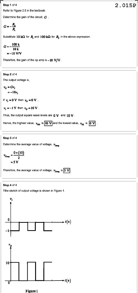 Step 1 of 4 2.015P Refer to Figure 2.5 in the textbook. Determine the gain of the circuit, G = Substitute 10 kΩ for and 100 kΩ for in the above expression. =-10 V/V Therefore, the gain of the op amp is-10 V/V Step 2 of 4 The output voltage is, = Gv, If v, = V then v, = V then Thus, the output square wave levels are and Hence, the highest value, is 10 V and the lowest value, is Step 3 of 4 Determine the average value of voltage, 0+ =5V Therefore, the average value of voltage, is Step 4 of 4 Tthe sketch of output voltage is shown in Figure 1. v₁ 0 t(s) -1 10 0 t(s) Figure 1