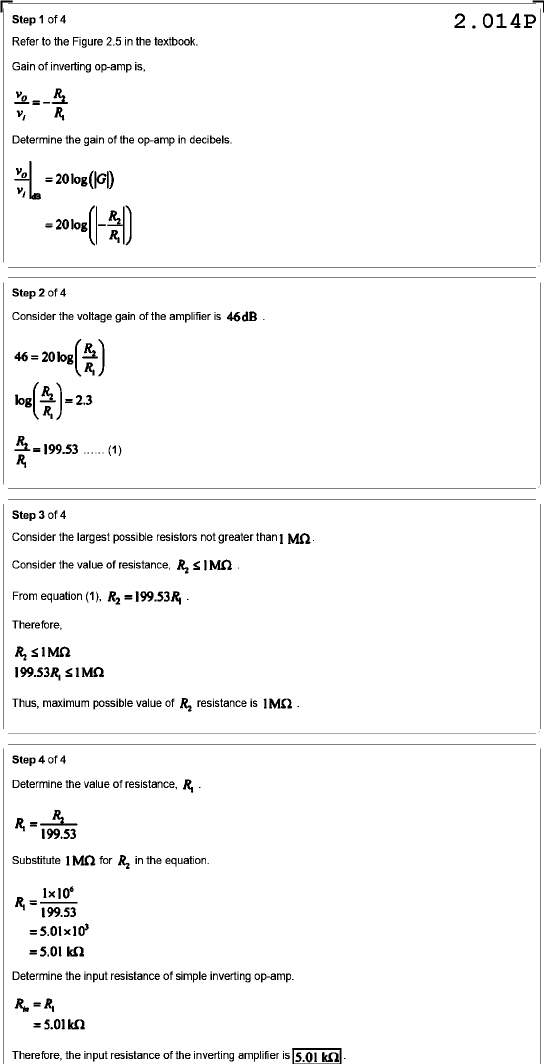 Step 1 of 4 2.014P Refer to the Figure 2.5 in the textbook. Gain of inverting op-amp is, v, Determine the gain of the op-amp in decibels. Step 2 of 4 Consider the voltage gain of the amplifier is = 199.53 (1) Step 3 of 4 Consider the largest possible resistors not greater than 1 Consider the value of resistance, R₂ From equation (1), Therefore, 199.53R, Thus, maximum possible value of resistance is Step 4 of 4 Determine the value of resistance, R₁ Substitute 1 for in the equation. Determine the input resistance of simple inverting op-amp. = =5.01kQ Therefore, the input resistance of the inverting amplifier is