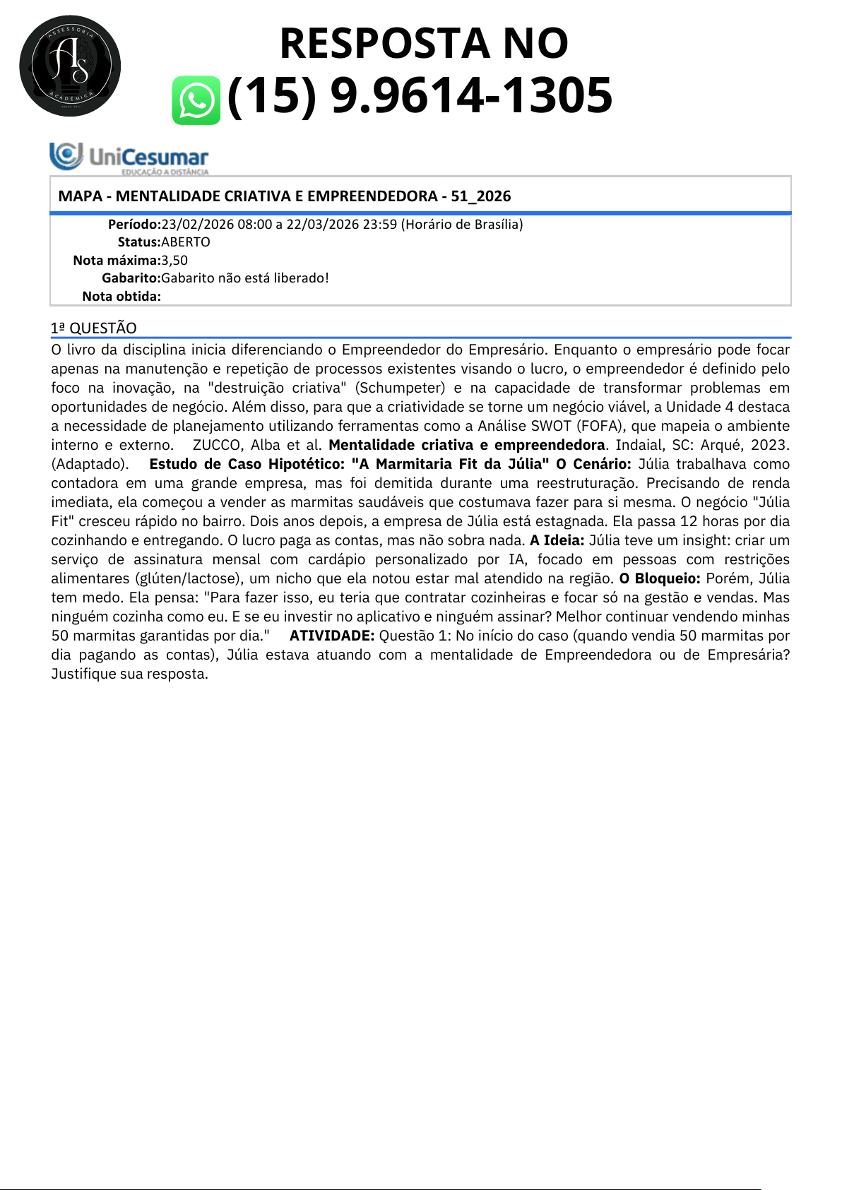 O livro da disciplina inicia diferenciando o Empreendedor do Empresário. Enquanto o empresário pode focar apenas na manutenção e repetição de processos existentes visando o lucro, o empreendedor é definido pelo foco na inovação, na "destruição criativa" (Schumpeter) e na capacidade de transformar problemas em oportunidades de negócio. Além disso, para que a criatividade se torne um negócio viável, a Unidade 4 destaca a necessidade de planejamento utilizando ferramentas como a Análise SWOT (FOFA), que mapeia o ambiente interno e externo. ZUCCO, Alba et al. Mentalidade criativa e empreendedora. Indaial, SC: Arqué, 2023. (Adaptado). Estudo de Caso Hipotético: "A Marmitaria Fit da Júlia" O Cenário: Júlia trabalhava como contadora em uma grande empresa, mas foi demitida durante uma reestruturação. Precisando de renda imediata, ela começou a vender as marmitas saudáveis que costumava fazer para si mesma. O negócio "Júlia Fit" cresceu rápido no bairro. Dois anos depois, a empresa de Júlia está estagnada. Ela passa 12 horas por dia cozinhando e entregando. O lucro paga as contas, mas não sobra nada. A Ideia: Júlia teve um insight: criar um serviço de assinatura mensal com cardápio personalizado por IA, focado em pessoas com restrições alimentares (glúten/lactose), um nicho que ela notou estar mal atendido na região. O Bloqueio: Porém, Júlia tem medo. Ela pensa: "Para fazer isso, eu teria que contratar cozinheiras e focar só na gestão e vendas. Mas ninguém cozinha como eu. E se eu investir no aplicativo e ninguém assinar? Melhor continuar vendendo minhas 50 marmitas garantidas por dia." ATIVIDADE: Questão 1: No início do caso (quando vendia 50 marmitas por dia pagando as contas), Júlia estava atuando com a mentalidade de Empreendedora ou de Empresária? Justifique sua resposta. 1ª QUESTÃO MAPA - MENTALIDADE CRIATIVA E EMPREENDEDORA - 51_2026 Período:23/02/2026 08:00 a 22/03/2026 23:59 (Horário de Brasília) Status:ABERTO Nota máxima:3,50 Gabarito:Gabarito não está liberado! Nota obtida: (15) 9.9614‑1305 RESPOSTA NO Questão 2: Júlia começou o negócio logo após ser demitida, como podemos com base no livro classificar esse tipo de empreendedorismo? a) Empreendedorismo por Oportunidade. b) Empreendedorismo por Necessidade. c) Empreendedorismo Corporativo (Intraempreendedorismo). Indique qual desses tipos de empreendedorismo se aplica ao caso e justifique sua escolha, explicando a motivação inicial de Julia. Questão 3: Para ajudar Júlia a decidir se investe no novo app (Assinatura Personalizada), faça uma rápida Análise SWOT focada apenas no fator "Mercado de Restrições Alimentares". Nessa análise, identifique uma Oportunidade (Ambiente Externo) e também apresente uma Ameaça ou Fraqueza (Ambiente Interno/Externo) que está paralisando Júlia. Justifique ambas as respostas. Questão 04: Júlia está travada pelo medo de gastar suas economias desenvolvendo um aplicativo complexo que pode fracassar. Com base no conceito de Prototipagem (testar rápido e barato), explique por que Júlia não deve começar contratando programadores para desenvolver o aplicativo completo e sugira uma forma simples de como ela poderia criar um "protótipo de baixa fidelidade" para testar o serviço de assinatura de cardápios personalizados na próxima semana, sem gastar dinheiro com software neste momento do negócio. Orientações importantes: - Assista ao vídeo explicativo gravado pelo professor, disponível no ícone Material da Disciplina. - Realize a sua Atividade MAPA no formulário-padrão que está disponível para download no Material da Disciplina. - No formulário, há um espaço indicado para cada uma das 4 questões solicitadas nesta atividade. Cada resposta deve conter no mínimo 3 linhas e no máximo 5 linhas. - Faça a leitura do livro da disciplina e utilize outras fontes de pesquisa sobre o assunto. Os materiais utilizados para embasamento de resposta a esta atividade devem ser devidamente referenciados conforme as normas da ABNT. - Atente-se às instruções e intervenções realizadas pelos professores formadores e mediadores, tanto em aulas ao vivo quanto no ambiente on-line de aprendizagem (Studeo), por meio do Mural de avisos e Mensagem. - A atividade será aceita somente pelo Studeo; atividades fora do prazo não serão aceitas. - A atividade precisa ser desenvolvida por você, portanto, não utilize cópias indevidas de atividades já realizadas por terceiros, assim como cópias indevidas de textos disponíveis na web. - Certifique-se de que está encaminhando o arquivo correto no seu Studeo antes de finalizar, pois não haverá como editar e/ou enviar outro arquivo após a finalização. - Em casos de dúvidas, entre em contato com o seu Professor Mediador pelo Studeo, no Fale com o Mediador. - Atenção: se identificado plágio (cópia indevida de textos pesquisados ou cópia textual entre colegas), a atividade poderá ser zerada. Bons estudos! ALTERNATIVAS Nenhum arquivo enviado.