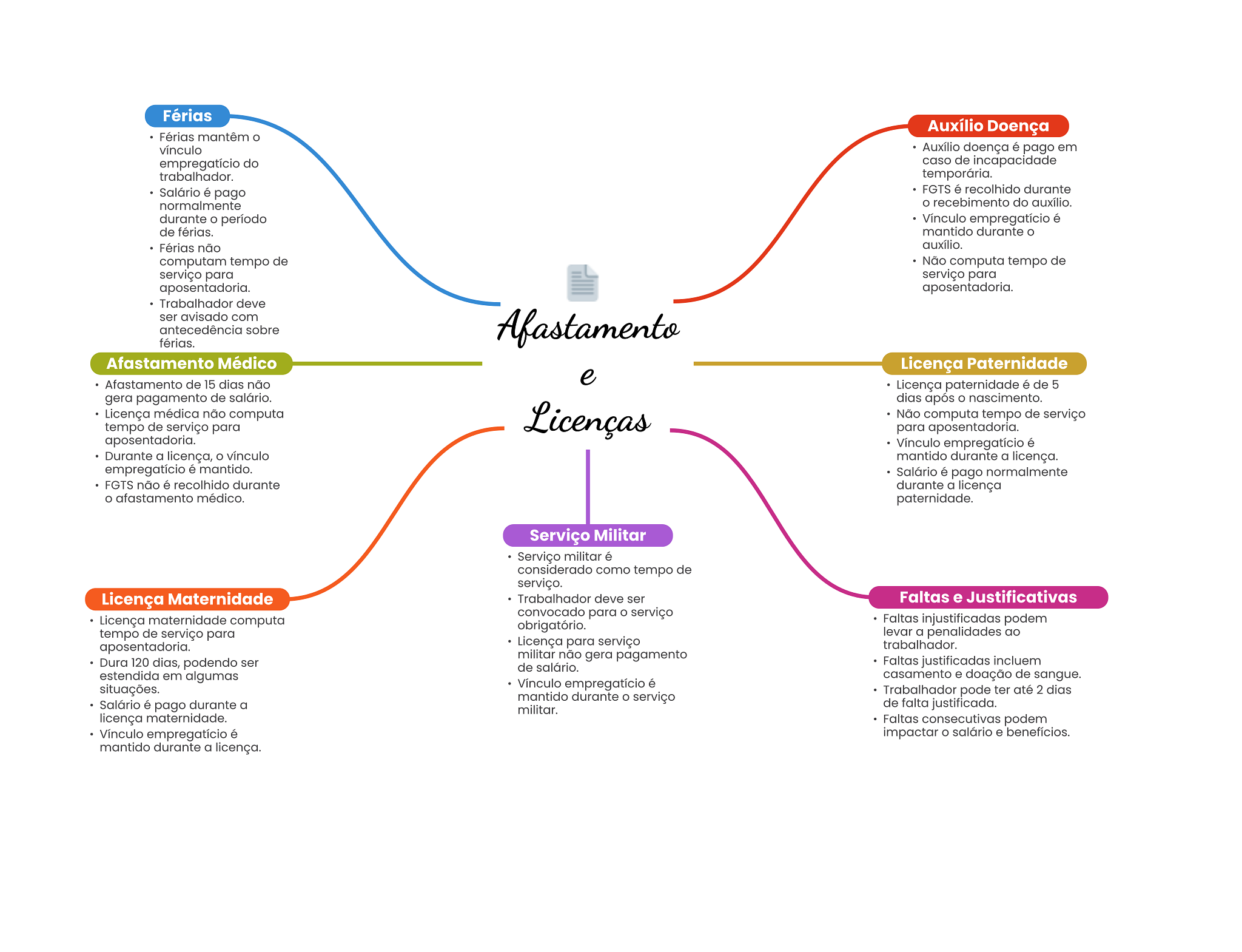 Férias Auxílio Doença Férias mantêm vínculo Auxílio doença é pago em empregatício do caso de incapacidade trabalhador. temporária. Salário é pago FGTS é recolhido durante normalmente recebimento do auxílio. durante período Vínculo empregatício é de férias. mantido durante O Férias não auxílio. computam tempo de Não computa tempo de serviço para serviço para aposentadoria. aposentadoria. Trabalhador deve ser avisado com antecedência sobre Afastamento férias. Afastamento Médico Licença Paternidade Afastamento de 15 dias não e Licença paternidade é de 5 gera pagamento de salário. dias após nascimento. Licença médica não computa Licenças Não computa tempo de serviço tempo de serviço para para aposentadoria. aposentadoria. Vínculo empregatício é Durante a licença, vínculo mantido durante a licença. empregatício é mantido. Salário é pago normalmente FGTS não é recolhido durante durante a licença afastamento médico. paternidade. Serviço Militar Serviço militar é considerado como tempo de serviço. Licença Maternidade Trabalhador deve ser Faltas e Justificativas convocado para serviço Licença maternidade computa obrigatório. Faltas injustificadas podem tempo de serviço para levar a penalidades ao aposentadoria. Licença para serviço trabalhador. militar não gera pagamento Dura 120 dias, podendo ser de salário. Faltas justificadas incluem estendida em algumas casamento e doação de sangue. situações. Vínculo empregatício é Trabalhador pode ter até 2 dias mantido durante O serviço Salário é pago durante a militar. de falta justificada. licença maternidade. Faltas consecutivas podem Vínculo empregatício é impactar salário e benefícios. mantido durante a licença.