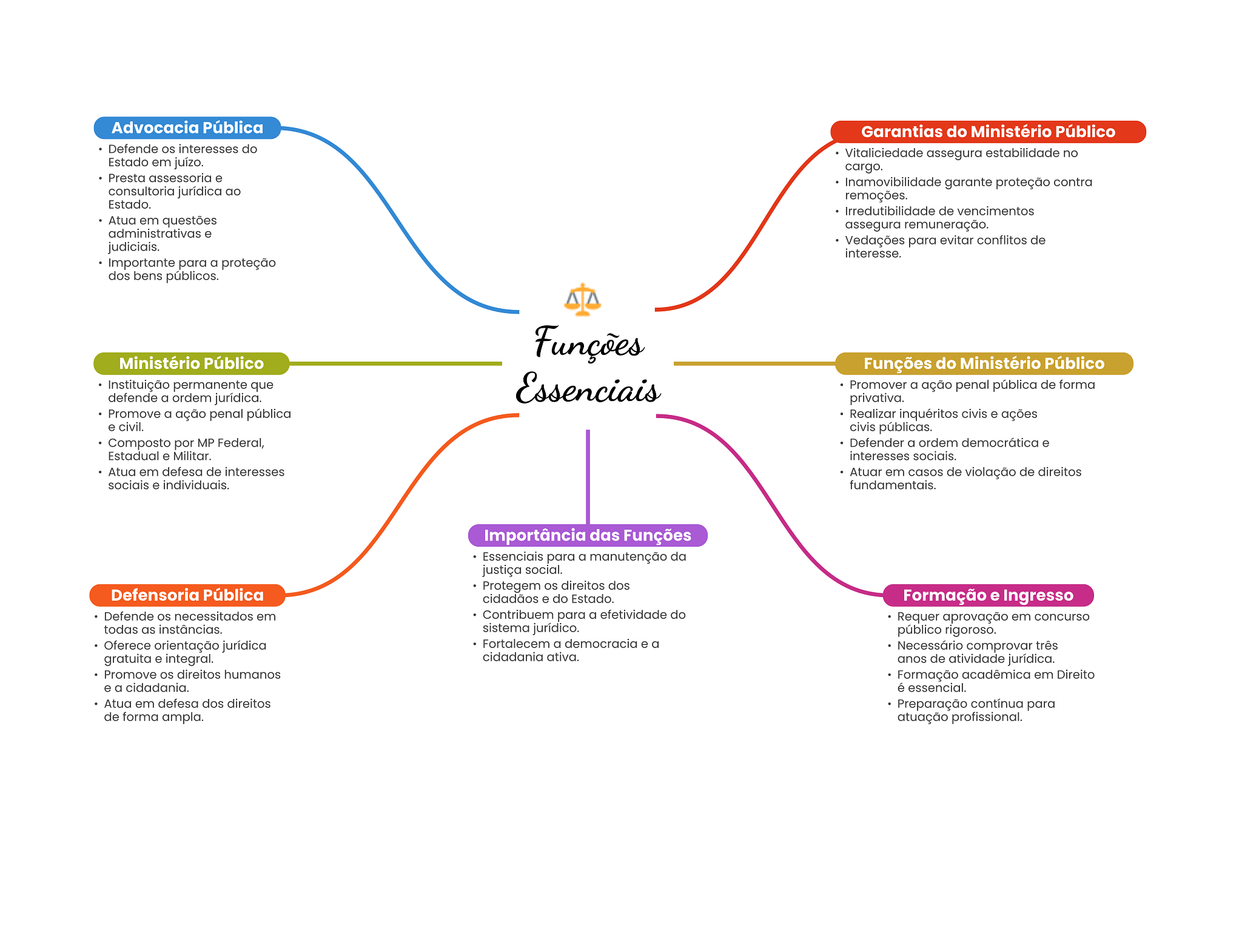 Advocacia Pública Garantias do Ministério Público Defende interesses do Vitaliciedade assegura estabilidade no Estado em juízo. cargo. Presta assessoria e Inamovibilidade garante proteção contra consultoria jurídica ao remoções. Estado. Irredutibilidade de vencimentos Atua em questões assegura remuneração. administrativas e judiciais. Vedações para evitar conflitos de interesse. Importante para a proteção dos bens públicos. Funções Ministério Público Funções do Ministério Público Instituição permanente que Essenciais Promover a ação penal pública de forma defende a ordem jurídica. privativa. Promove a ação penal pública Realizar inquéritos civis e ações e civil. civis públicas. Composto por MP Federal, Defender a ordem democrática e Estadual e Militar. interesses sociais. Atua em defesa de interesses Atuar em casos de violação de direitos sociais e individuais. fundamentais. Importância das Funções Essenciais para a manutenção da justiça social. Protegem OS direitos dos Defensoria Pública cidadãos e do Estado. Formação e Ingresso Defende necessitados em Contribuem para a efetividade do Requer aprovação em concurso todas as instâncias. sistema jurídico. público rigoroso. Oferece orientação jurídica Fortalecem a democracia e a Necessário comprovar três gratuita e integral. cidadania ativa. anos de atividade jurídica. Promove direitos humanos Formação acadêmica em Direito e a cidadania. é essencial. Atua em defesa dos direitos Preparação contínua para de forma ampla. atuação profissional.