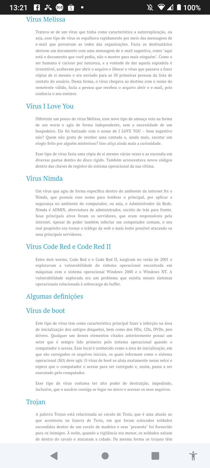 13:21 S 100% Vírus Melissa Tratava-se de um que tinha como característica a autorreplicação, ou seja, esse tipo de vírus se espalhava rapidamente por meio das mensagens de e-mail que povoavam as redes das organizações. Fazia os destinatários abrirem um documento com uma mensagem de e-mail sugestiva, como está 0 documento que você pediu, não 0 mostre para mais Como 0 ser humano é curioso por natureza, e a vontade de dar aquela espiadela é irresistível, acabavam por abrir 0 arquivo e liberar 0 que passava a fazer cópias de si mesmo e era enviado para as 50 primeiras pessoas da lista de contato do usuário. Dessa forma, 0 vírus chegava ao destino com 0 nome do remetente válido, fazia a pessoa que recebeu 0 arquivo abrir 0 e-mail, pois conhecia 0 seu emissor. Vírus I Love You Diferente um pouco do vírus Melissa, esse novo tipo de ameaça veio na forma de um worm e agia de forma independente, sem a necessidade de um hospedeiro. Ele foi batizado com nome de I LOVE YOU bem sugestivo não? Quem não gosta de receber uma cantada e, ainda mais, escutar um elogio feito por alguém misterioso? Isso atiça ainda mais a curiosidade. Esse tipo de fazia uma cópia de si mesmo vezes e as escondia em diversas pastas dentro do disco rígido. Também acrescentava novos códigos dentro das chaves de registro do sistema operacional da sua Vírus Nimda Um virus que agiu de forma especifica dentro do ambiente da internet foi Nimda, que possuía esse nome para lembrar principal, por aplicar a segurança no ambiente do computador, ou seja, Administrador da Rede. Nimda é ADMIN, abreviatura de administrador, escrito de tras para frente. Seus principais alvos foram os servidores, que eram responsáveis pela internet. Apesar de poder também infectar um computador comum, seu real propósito era tornar trafego da web mais lento possível atacando os seus principais servidores. Vírus Code Red e Code Red II Estes dois worms, Code Red e Code Red II, surgiram no verão de 2001 e exploravam a vulnerabilidade do sistema operacional encontrada em com sistema operacional Windows 2000 e Windows NT. A vulnerabilidade explorada era um problema que existia nesses sistemas operacionais relacionada à sobrecarga do buffer. Algumas definições Vírus de boot Este tipo de virus tem como característica principal fazer a infecção na area de inicialização dos antigos disquetes, bem como dos HDs, CDs, DVDs, pen drivers. Qualquer um desses elementos citados anteriormente possui um setor que é sempre lido primeiro pelo sistema operacional quando 0 computador 0 acessa. Esse local é conhecido como a area de inicialização, em que são carregados os arquivos iniciais, os quais informam como 0 sistema operacional (SO) deve agir. 0 virus de boot se aloja exatamente nesse setor e espera que 0 computador 0 acesse para ser carregado e, assim, passa a ser executado pelo computador. Esse tipo de vírus costuma ter alto poder de destruição, impedindo, inclusive, que 0 consiga se logar no micro e acessar os seus arquivos. Trojan A palavra Trojan está relacionada ao cavalo de Troia, que é uma alusão ao que aconteceu na Guerra de Troia, em que foram colocados soldados escondidos dentro de um cavalo de madeira e esse "presente" foi fornecido para os inimigos. À noite, quando a vigilância era menor, os soldados de dentro do cavalo e atacaram a cidade. Da mesma forma os trojans têm