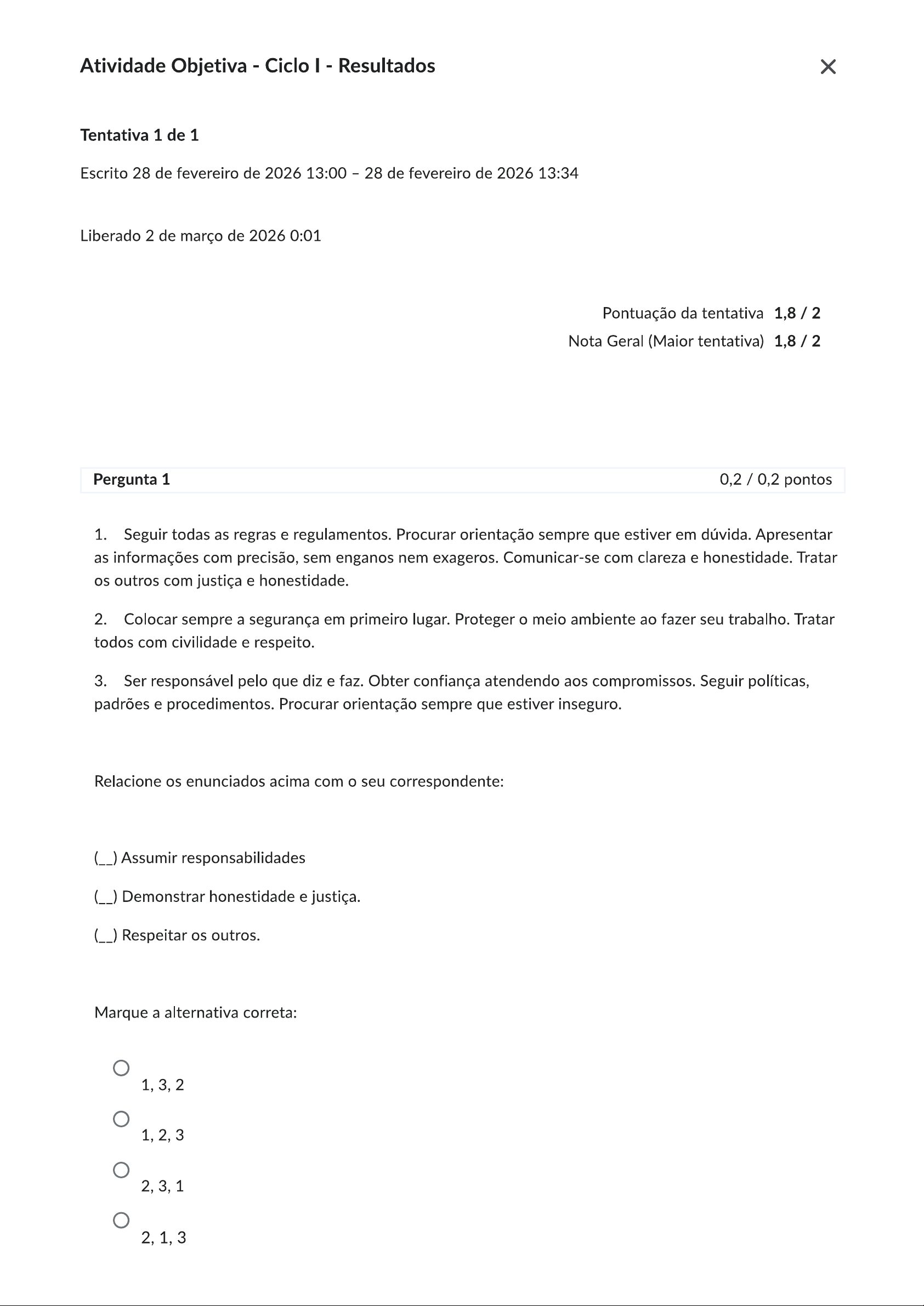 Atividade Objetiva Ciclo I Resultados X Tentativa 1 de 1 Escrito 28 de fevereiro de 2026 13:00 28 de fevereiro de 2026 13:34 Liberado 2 de março de 2026 0:01 Pontuação da tentativa Nota Geral (Maior tentativa) Pergunta 1 0,2 / 0,2 pontos 1. Seguir todas as regras e regulamentos. Procurar orientação sempre que estiver em dúvida. Apresentar as informações com precisão, sem enganos nem exageros. Comunicar-se com clareza e honestidade. Tratar os outros com justiça e honestidade. 2. Colocar sempre a segurança em primeiro lugar. Proteger o meio ambiente ao fazer seu trabalho. Tratar todos com civilidade e respeito. 3. Ser responsável pelo que diz e faz. Obter confiança atendendo aos compromissos. Seguir políticas, padrões e procedimentos. Procurar orientação sempre que estiver inseguro. Relacione os enunciados acima com seu correspondente: (__) Assumir responsabilidades (__) Demonstrar honestidade e justiça. (__) Respeitar os outros. Marque a alternativa correta: 1,3,2 1,2,3 2,3,1 2,1,33,1,2 Pergunta 2 0,2 / 0,2 pontos Considere as proposições: I. Para evitar problemas à sua imagem, as empresas criam procedimentos que devem ser seguidos por todos os seus colaboradores e estabelecem padrões na conduta dos seus colaboradores a partir dos seus objetivos, dos objetivos negociais institucionais. POR ESSA RAZÃO II. As organizações ou grupos sociais criam seus códigos de conduta ou de procedimentos éticos, justamente para evitar que o individualismo deturpe a ética. A respeito dessas asserções, assinale a opção correta: A asserção é uma proposição verdadeira, e a é uma proposição falsa. As asserções e são proposições verdadeiras, e a é uma decorrência correta da I. A asserção é uma proposição falsa, e a é uma proposição verdadeira. As asserções e são proposições verdadeiras, mas a não é uma decorrência correta da I. As asserções e são proposições falsas. Pergunta 3 0 / 0,2 pontos Quanto mais se ouvia Eichmann falar, mais óbvio ficava que sua incapacidade de falar estava intimamente relacionada com sua incapacidade de pensar, ou seja, de pensar do ponto de vista de outra pessoa." ARENDT, Hannah. Eichmann em Jerusalém. São Paulo: Companhia das Letras, 1999. 62] Avalie as asserções a seguir e a relação proposta entre elas. I. Segunda a ideia de "banalidade do mal", as pessoas que podem ser mais monstruosas em suas ações são as que mais claramente demonstram sua incapacidade de se relacionar e ter qualquer ato considerado bom em seu cotidiano. PORQUEII. simples fato de pensar de modo raso, de modo medíocre, é capaz de levar um indivíduo a ser culpado de grandes atrocidades em seu cotidiano. A respeito dessas asserções, assinale a opção correta: As asserções e são proposições verdadeiras, mas a não é uma justificativa correta da I. As asserções e são proposições falsas. As asserções e são proposições verdadeiras, e a é uma justificativa correta da I. A asserção I é uma proposição verdadeira, e a é uma proposição falsa. A asserção é uma proposição falsa, e a é uma proposição verdadeira. Pergunta 4 0,2 / 0,2 pontos Ana Maria demite responsável por exibir vídeo de macacos em caso de racismo A apresentadora classificou o ato como uma "falha imperdoável". Imagens de macacos foram exibidas após o anúncio de uma reportagem sobre o racismo sofrido pelos filhos de Giovanna Ewbank e Bruno Gagliasso em Portugal 01/08/22) Avalie as asserções a seguir e a relação proposta entre elas. I. Quando a apresentadora sente que algo foi errado na situação, ainda que não chegue a justificar racionalmente, isto se deve ao seu senso moral. PORQUE II. senso moral, do mesmo modo como a consciência moral, parte de um entendimento, justificado racionalmente, sobre fatos do cotidiano. A respeito dessas asserções, assinale a opção correta: As asserções I e são proposições falsas. A asserção é uma proposição verdadeira, e a é uma proposição falsa. As asserções e são proposições verdadeiras, mas a não é uma justificativa correta da I.As asserções I e são proposições verdadeiras, e a é uma justificativa correta da I. A asserção é uma proposição falsa, e a é uma proposição verdadeira. Pergunta 5 0,2 / 0,2 pontos Missão: É o propósito de a empresa existir. Visão: É a situação em que a empresa deseja chegar (em período definido de tempo). Valores: são os ideais de atitude, comportamento e resultados que devem estar presentes nos colaboradores e nas relações da empresa com seus clientes, fornecedores e parceiros. (Disponível em: Valores.PDF, Acesso em 09/08/2021) Leia as proposições. I. A partir da Missão, da Visão e dos Valores estabelecidos por uma empresa, um colaborador deve adequar sua postura e sua atuação às vezes, não apenas dentro da empresa. II. Toda vez que houver conflito entre os valores pessoais e os da empresa, o colaborador deve se sujeitar e rever seus valores para se adequar àquilo que a empresa quer. III. Atuar em uma empresa significa assumir uma postura dentro da sociedade, a partir do que a instituição realiza e como o faz; ou seja, de certo modo, o colaborador também é responsável pelas ações da empresa. É correto o que se afirma apenas em: III. I. II. I e II. e III. Pergunta 6 0,2 / 0,2 pontos U022024.1LC-03M capitalismo é um sistema econômico que se baseia na propriedade privada dos meios de produção, na busca pelo lucro e na livre concorrência. No entanto, a relação entre ética e capitalismo tem sido objeto de debate ao longo da história. Por um lado, alguns argumentam que capitalismo promove a eficiência econômica e a liberdade individual, enquanto outros questionam sua ética, apontando para questões como desigualdade social, exploração laboral e degradação ambiental.Nesse contexto, emerge a necessidade de refletir sobre os valores éticos que orientam as práticas empresariais e as relações econômica