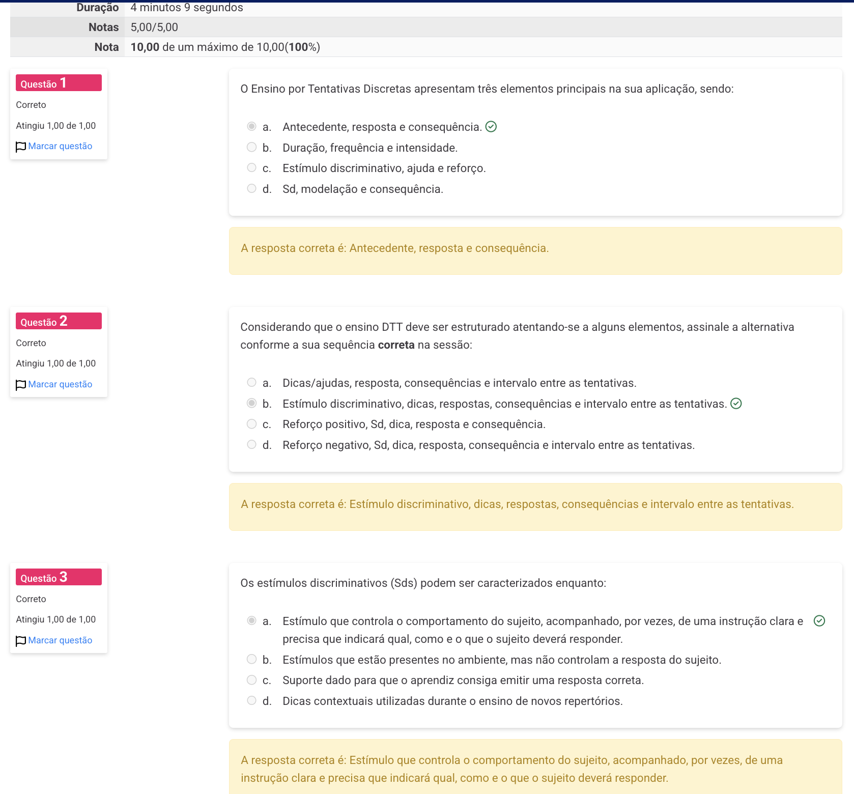 Duração 4 minutos 9 segundos Notas 5,00/5,00 Nota 10,00 de um máximo de 10,00(100%) Questão 1 0 Ensino por Tentativas Discretas apresentam três elementos principais na sua aplicação, sendo: Correto Atingiu 1,00 de 1,00 a. Antecedente, resposta e consequência. Marcar questão b. Duração, frequência e intensidade. C. Estímulo discriminativo, ajuda e reforço. d. Sd, modelação e consequência. A resposta correta é: Antecedente, resposta e consequência. Questão 2 Considerando que ensino DTT deve ser estruturado atentando-se a alguns elementos, assinale a alternativa Correto conforme a sua sequência correta na sessão: Atingiu 1,00 de 1,00 Marcar questão a. Dicas/ajudas, resposta, consequências e intervalo entre as tentativas. b. Estímulo discriminativo, dicas, respostas, consequências e intervalo entre as tentativas. C. Reforço positivo, Sd, dica, resposta e consequência. d. Reforço negativo, Sd, dica, resposta, consequência e intervalo entre as tentativas. A resposta correta é: Estímulo discriminativo, dicas, respostas, consequências e intervalo entre as tentativas. Questão 3 Os estímulos discriminativos (Sds) podem ser caracterizados enquanto: Correto Atingiu 1,00 de 1,00 a. Estímulo que controla comportamento do sujeito, acompanhado, por vezes, de uma instrução clara e Marcar questão precisa que indicará qual, como e o que o sujeito deverá responder. b. Estímulos que estão presentes no ambiente, mas não controlam a resposta do sujeito. C. Suporte dado para que o aprendiz consiga emitir uma resposta correta. d. Dicas contextuais utilizadas durante o ensino de novos repertórios. A resposta correta é: Estímulo que controla comportamento do sujeito, acompanhado, por vezes, de uma instrução clara e precisa que indicará qual, como e que sujeito deverá responder.