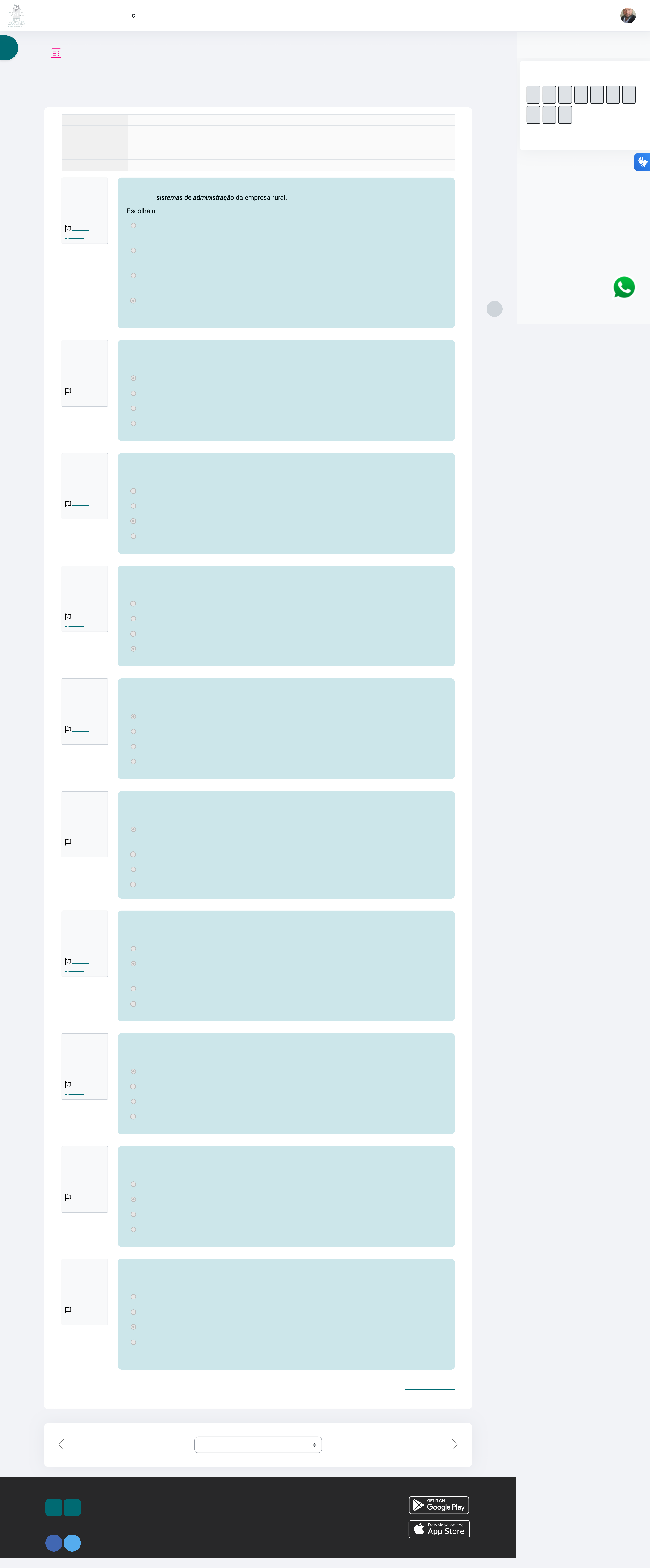 QUESTIONÁRI O 01 CURSOS FUNEC 〉 Graduação - EAD 〉 Aluno EAD 〉 JUNÇÕES DE TURMA 〉 Administração Rural 〉 AVALIAÇÕES 〉 QUESTIONÁRIO 01 Questão 1 Completo Atingiu 2,00 de 2,00 Marcar questão Questão 2 Completo Atingiu 2,00 de 2,00 Marcar questão Questão 3 Completo Atingiu 2,00 de 2,00 Marcar questão Questão 4 Completo Atingiu 2,00 de 2,00 Marcar questão Questão 5 Completo Atingiu 2,00 de 2,00 Marcar questão Questão 6 Completo Atingiu 2,00 de 2,00 Marcar questão Questão 7 Completo Atingiu 2,00 de 2,00 Marcar questão Questão 8 Completo Atingiu 2,00 de 2,00 Marcar questão Questão 9 Completo Atingiu 2,00 de 2,00 Marcar questão Questão 10 Completo Atingiu 2,00 de 2,00 Marcar questão Situação Finalizada Iniciado segunda-feira, 9 fev. 2026, 09:35 Concluído quarta-feira, 18 fev. 2026, 09:03 Duração 8 dias 23 horas Nota 20,00 de um máximo de 20,00(100%) Terminar revisão --> Marque a alternativa CORRETA que seja mais relevante sobre a di�culdade que os empresários tem de adotar os sistemas de administração da empresa rural. Escolha uma opção: a. Os sistemas de controles existentes são de fácil manuseio, pois todos têm um ótimo conhecimento dessas funções. b. As pessoas envolvidas nos processos de produção são altamente quali�cadas e têm facilidade na anotação de diversos controles. Não necessitando de treinamentos. c. Os sistemas de gestão/administração são adotados facilmente por todos, pois os recursos humanos nas empresas são mais propensos a adotarem novas tecnologias. d. Uma di�culdade identi�cada como principal é a coleta de dados em campo, principalmente pelo baixo nível de conhecimento de seus funcionários. Quais são os benefícios de uma boa Gestão de Recursos Humanos no meio rural? Escolha uma opção: a. Todas as alternativas b. Melhoria do clima organizacional c. Aumento da qualidade dos produtos agrícolas d. Redução dos custos de produção O que é essencial para o sucesso da Gestão de Recursos Humanos no meio rural? Escolha uma opção: a. Uso intensivo de agrotóxicos b. Aumento da carga horária de trabalho dos funcionários c. Investimento em treinamento e capacitação dos trabalhadores rurais d. Uso de técnicas de produção convencionais Quais são as funções da administração? Escolha uma opção: a. Planejamento, organização, colheita, comercialização, plantio b. Controle, colheita, comercialização e direção c. Organização, direção, comercialização e planejamento d. Planejamento, organização, direção e controle Qual é o objetivo principal da Gestão Financeira? Escolha uma opção: a. Garantir a sustentabilidade �nanceira da empresa. b. Minimizar os custos operacionais, sem se preocupar com os custos a longo prazo. c. Somente aumentar a participação de mercado. d. Minimizar o lucro a curto prazo. O que é a gestão de produção agrícola? Escolha uma opção: a. É o conjunto de práticas e estratégias para maximizar a e�ciência e produtividade nas atividades agrícolas. b. A gestão das operações �nanceiras de uma empresa. c. A gestão das operações �nanceiras de uma empresa. d. O processo de planejar e somente coordenar a distribuição dos produtos agrícolas no mercado. O que é o balanço patrimonial? Escolha uma opção: a. Um relatório que apresenta somente as despesas da empresa b. Um demonstrativo que apresenta o patrimônio e as obrigações da empresa em determinado período c. Um documento que mostra o �uxo de caixa da empresa d. Um registro das transações �nanceiras da empresa Qual é o principal desa�o da Gestão de Recursos Humanos no meio rural? Escolha uma opção: a. Di�culdade em encontrar mão de obra quali�cada b. Escassez de recursos �nanceiros c. Falta de tecnologia adequada d. Baixa produtividade das atividades agrícolas Como a tecnologia pode contribuir para a Gestão de Recursos Humanos no meio rural? Escolha uma opção: a. Substituindo completamente a mão de obra humana. b. Automatizando as tarefas repetitivas e burocráticas. c. Reduzindo a necessidade de treinamento e capacitação dos funcionários. d. Aumentando o isolamento social dos trabalhadores rurais. Qual o objetivo da função administrativa DIREÇÃO? Escolha uma opção: a. Analisar os �uxos de pagamentos e anotar as contas a pagar da empresa b. Controlar todas as ações a serem executadas e manter todos os registros atualizados c. Compreender o ato de comandar, dirigir e gerir a empresa d. Organizar todas as atividades agrícolas e pecuárias da empresa rural para que sejam e�cientes e com lucros crescentes Atividade anter ior Existe Tecnologia no Campo? Seguir para... Próxima at iv idade QUESTIONÁRIO 02 Entre em contato ✉ Siga nossas redes sociais Você acessou como Cleiton José reis (Sair) Baixar o aplicativo móvel. Baixar o aplicativo móvel. ? Navegação do questionário Terminar revisão 1 2 3 4 5 6 7 8 9 10 × Página inicial Painel Meus cursos FINANCEIRO PORTAIS AGENDAMENTO DE PRÁTICAS https://ava.funec.br/course/index.php?categoryid=10 https://ava.funec.br/course/index.php?categoryid=17 https://ava.funec.br/course/index.php?categoryid=19 https://ava.funec.br/course/index.php?categoryid=77 https://ava.funec.br/course/view.php?id=2118 https://ava.funec.br/course/section.php?id=10159 https://ava.funec.br/mod/quiz/view.php?id=25557 https://ava.funec.br/mod/page/view.php?id=25972&forceview=1 https://ava.funec.br/mod/quiz/view.php?id=25558&forceview=1 tel:RA (33) 99986-3935 mailto:secretariaead@funec.br https://www.facebook.com/caratingaunec https://twitter.com/caratingaunec https://ava.funec.br/user/profile.php?id=23683 https://ava.funec.br/login/logout.php?sesskey=nMQeo14H5F https://download.moodle.org/mobile?version=2024100705.05&lang=pt_br&iosappid=633359593&androidappid=com.moodle.moodlemobile&siteurl=https%3A%2F%2Fava.funec.br https://download.moodle.org/mobile https://play.google.com/store/apps/details?id=com.moodle.moodl