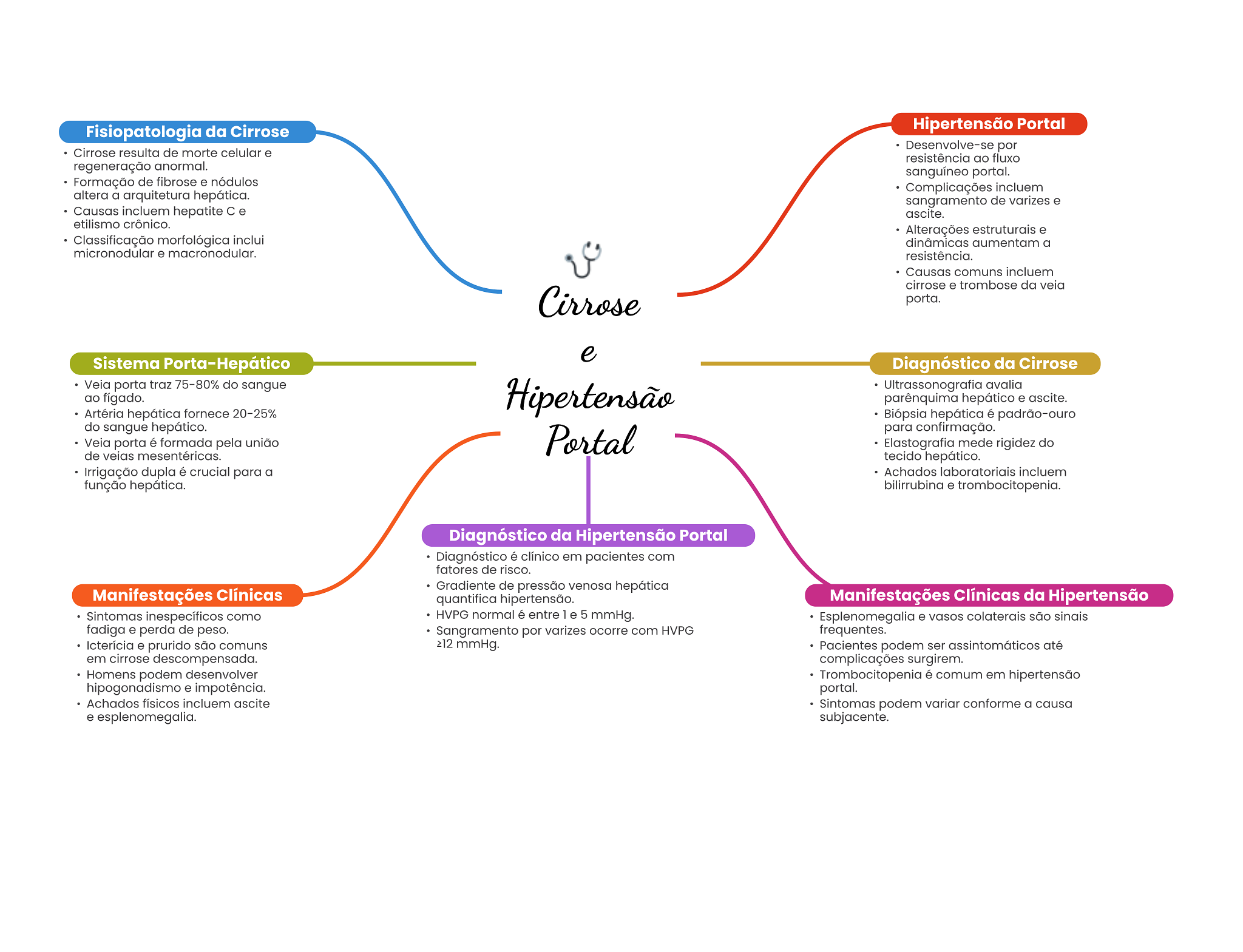 Fisiopatologia da Cirrose Hipertensão Portal Desenvolve-se por Cirrose resulta de morte celular e resistência ao fluxo regeneração anormal. sanguíneo portal. Formação de fibrose e nódulos Complicações incluem altera a arquitetura hepática. sangramento de varizes e Causas incluem hepatite C e ascite. etilismo crônico. Alterações estruturais e Classificação morfológica inclui dinâmicas aumentam a micronodular e macronodular. resistência. Causas comuns incluem cirrose e trombose da veia Cirrose porta. e Sistema Porta-Hepático Diagnóstico da Cirrose Veia porta traz 75-80% do sangue Hipertensão Ultrassonografia avalia ao fígado. parênquima hepático e ascite. Artéria hepática fornece 20-25% Biópsia hepática é padrão-ouro do sangue hepático. para confirmação. Veia porta é formada pela união Portal Elastografia mede rigidez do de veias mesentéricas. tecido hepático. Irrigação dupla é crucial para a Achados laboratoriais incluem função hepática. bilirrubina e trombocitopenia. Diagnóstico da Hipertensão Portal Diagnóstico é clínico em pacientes com fatores de risco. Gradiente de pressão venosa hepática Manifestações Clínicas quantifica hipertensão. Manifestações Clínicas da Hipertensão Sintomas inespecíficos como HVPG normal é entre 1 e 5 mmHg. Esplenomegalia e vasos colaterais são sinais fadiga e perda de peso. Sangramento por varizes ocorre com HVPG frequentes. Icterícia e prurido são comuns mmHg. Pacientes podem ser assintomáticos até em cirrose descompensada. complicações surgirem. Homens podem desenvolver Trombocitopenia é comum em hipertensão hipogonadismo e impotência. portal. Achados físicos incluem ascite Sintomas podem variar conforme a causa e esplenomegalia. subjacente.