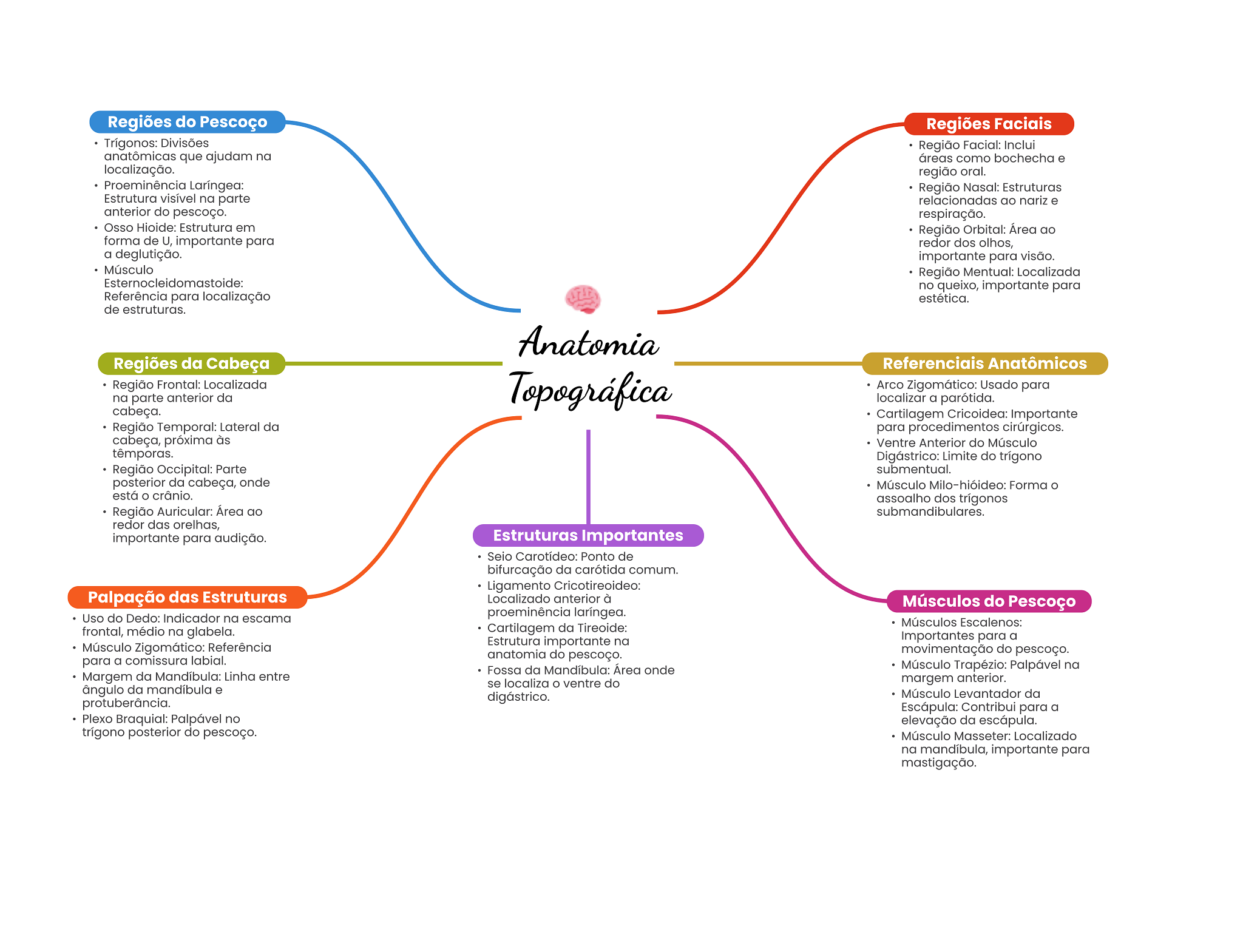Regiões do Pescoço Regiões Faciais Trígonos: Divisões Região Facial: Inclui anatômicas que ajudam na áreas como bochecha e localização. região oral. Proeminência Região Nasal: Estruturas Estrutura visível na parte relacionadas ao nariz e anterior do pescoço. respiração. Osso Hioide: Estrutura em Região Orbital: Área ao forma de U, importante para redor dos olhos, a deglutição. importante para visão. Músculo Região Mentual: Localizada no queixo, importante para Referência para localização estética. de estruturas. Anatomia Regiões da Cabeça Referenciais Anatômicos Região Frontal: Localizada na parte anterior da Topográfica Arco Zigomático: Usado para localizar a parótida. cabeça. Cartilagem Cricoidea: Importante Região Temporal: Lateral da para procedimentos cirúrgicos. cabeça, próxima às Ventre Anterior do Músculo têmporas. Digástrico: Limite do trígono Região Occipital: Parte submentual. posterior da cabeça, onde Músculo Milo-hióideo: Forma está O crânio. assoalho dos trígonos Região Auricular: Área ao submandibulares. redor das orelhas, importante para audição. Estruturas Importantes Seio Carotídeo: Ponto de bifurcação da carótida comum. Ligamento Cricotireoideo: Palpação das Estruturas Localizado anterior à Músculos do Pescoço Uso do Dedo: Indicador na escama proeminência laríngea. Músculos Escalenos: frontal, médio na glabela. Cartilagem da Tireoide: Estrutura importante na Importantes para a Músculo Zigomático: Referência anatomia do pescoço. movimentação do pescoço. para a comissura labial. Fossa da Mandíbula: Área onde Músculo Trapézio: Palpável na Margem da Mandíbula: Linha entre se localiza O ventre do margem anterior. ângulo da e protuberância. digástrico. Músculo Levantador da Escápula: Contribui para a Plexo Braquial: Palpável no elevação da escápula. trígono posterior do pescoço. Músculo Masseter: Localizado na mandíbula, importante para mastigação.