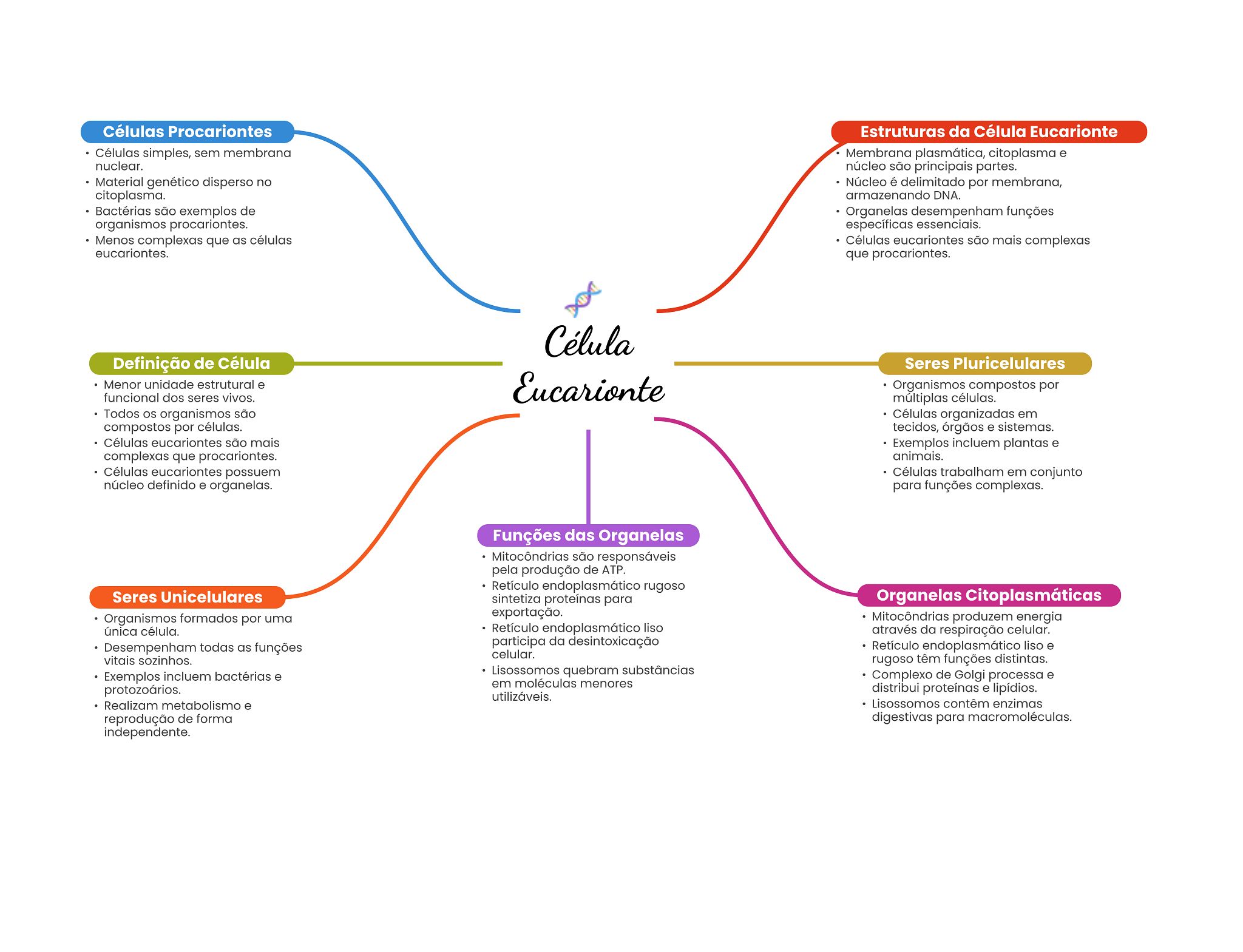 Células Procariontes Estruturas da Célula Eucarionte Células simples, sem membrana Membrana plasmática, citoplasma e nuclear. núcleo são principais partes. Material genético disperso no Núcleo é delimitado por membrana, citoplasma. armazenando DNA. Bactérias são exemplos de Organelas desempenham funções organismos procariontes. específicas essenciais. Menos complexas que as células Células eucariontes são mais complexas eucariontes. que procariontes. Célula Definição de Célula Seres Pluricelulares Menor unidade estrutural e Eucarionte Organismos compostos por funcional dos seres vivos. múltiplas células. Todos OS organismos são Células organizadas em compostos por células. tecidos, órgãos e sistemas. Células eucariontes são mais Exemplos incluem plantas e complexas que procariontes. animais. Células eucariontes possuem Células trabalham em conjunto núcleo definido e organelas. para funções complexas. Funções das Organelas Mitocôndrias são responsáveis pela produção de ATP. Retículo endoplasmático rugoso Seres Unicelulares sintetiza proteínas para Organelas Citoplasmáticas Organismos formados por uma exportação. Mitocôndrias produzem energia única célula. Retículo endoplasmático liso através da respiração celular. Desempenham todas as funções participa da desintoxicação Retículo endoplasmático liso e celular. vitais sozinhos. rugoso têm funções distintas. Exemplos incluem bactérias e Lisossomos quebram substâncias Complexo de Golgi processa e em moléculas menores protozoários. distribui proteínas e lipídios. utilizáveis. Realizam metabolismo e Lisossomos contêm enzimas reprodução de forma digestivas para independente.