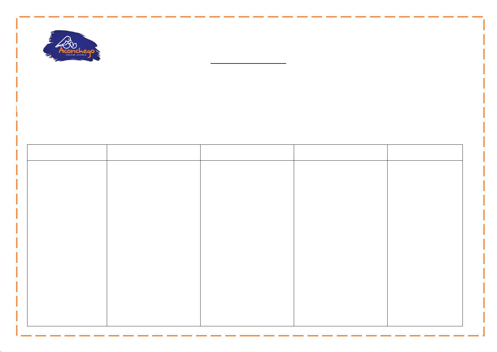Planejamento Semanal Auxiliar titular Semana de : Turma (s): Cuidado A/ B Campos de Experiências: Objetivos de aprendizagem: Projeto/Tema: Direitos de aprendizagem: Brincar, conviver, expressar, conhecer-se, participar e explorar. Campos de Experiências comuns a todos: O eu, o outro e o nós e Corpo, Gestos e Movimentos. SEGUNDA-FEIRA TERÇA-FEIRA QUARTA-FEIRA QUINTA-FEIRA SEXTA-FEIRA image1.png image10.png