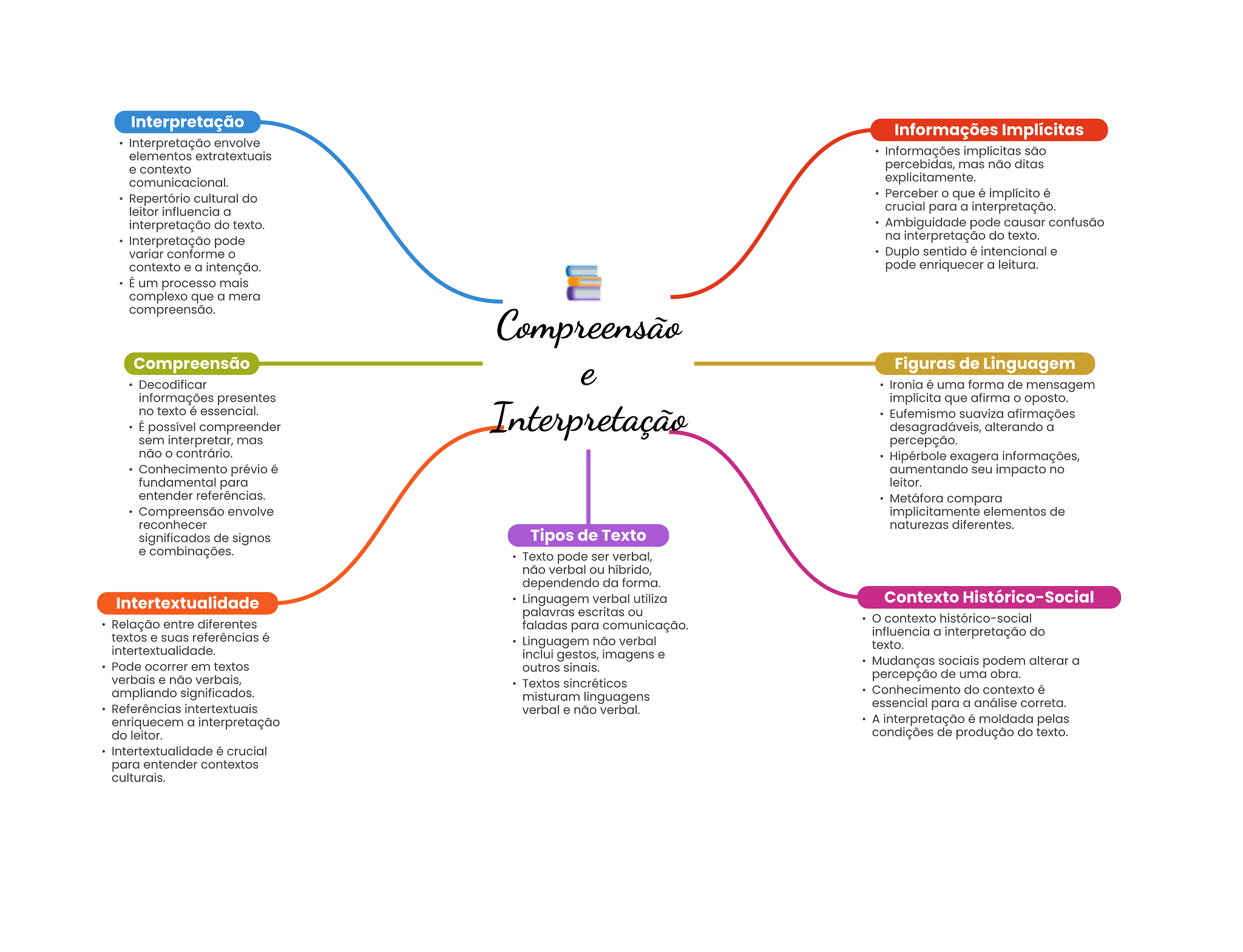 Interpretação Informações Implícitas Interpretação envolve elementos extratextuais Informações implícitas são e contexto percebidas, mas não ditas comunicacional. explicitamente. Repertório cultural do Perceber que é implícito é leitor influencia a crucial para a interpretação. interpretação do texto. Ambiguidade pode causar confusão Interpretação pode na interpretação do texto. variar conforme Duplo sentido é intencional e contexto e a intenção. pode enriquecer a leitura. É um processo mais complexo que a mera compreensão. Compreensão Compreensão Figuras de Linguagem Decodificar e Ironia é uma forma de mensagem informações presentes implícita que afirma oposto. no texto é essencial. É possível compreender Interpretação Eufemismo suaviza afirmações desagradáveis, alterando a sem interpretar, mas percepção. não contrário. Hipérbole exagera informações, Conhecimento prévio é aumentando seu impacto no fundamental para leitor. entender referências. Metáfora compara Compreensão envolve implicitamente elementos de reconhecer naturezas diferentes. significados de signos Tipos de Texto e combinações. Texto pode ser verbal, não verbal ou híbrido, dependendo da forma. Intertextualidade Linguagem verbal utiliza Contexto Histórico-Social palavras escritas ou contexto histórico-social Relação entre diferentes faladas para comunicação. textos e suas referências é influencia a interpretação do Linguagem não verbal intertextualidade. texto. inclui gestos, imagens e Pode ocorrer em textos outros sinais. Mudanças sociais podem alterar a verbais e não verbais, percepção de uma obra. Textos sincréticos ampliando significados. Conhecimento do contexto é misturam linguagens Referências intertextuais verbal e não verbal. essencial para a análise correta. enriquecem a interpretação A interpretação é moldada pelas do leitor. condições de produção do texto. Intertextualidade é crucial para entender contextos culturais.