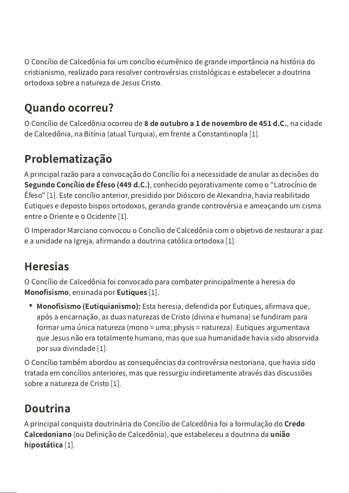 Concílio de Calcedônia O Concílio de Calcedônia foi um concílio ecumênico de grande importância na história do cristianismo, realizado para resolver controvérsias cristológicas e estabelecer a doutrina ortodoxa sobre a natureza de Jesus Cristo. Quando ocorreu? O Concílio de Calcedônia ocorreu de 8 de outubro a 1 de novembro de 451 d.C., na cidade de Calcedônia, na Bitínia (atual Turquia), em frente a Constantinopla [1]. Problematização A principal razão para a convocação do Concílio foi a necessidade de anular as decisões do Segundo Concílio de Éfeso (449 d.C.), conhecido pejorativamente como o "Latrocínio de Éfeso" [1]. Este concílio anterior, presidido por Dióscoro de Alexandria, havia reabilitado Eutiques e deposto bispos ortodoxos, gerando grande controvérsia e ameaçando um cisma entre o Oriente e o Ocidente [1]. O Imperador Marciano convocou o Concílio de Calcedônia com o objetivo de restaurar a paz e a unidade na Igreja, afirmando a doutrina católica ortodoxa [1]. Heresias O Concílio de Calcedônia foi convocado para combater principalmente a heresia do Monofisismo, ensinada por Eutiques [1]. • Monofisismo (Eutiquianismo): Esta heresia, defendida por Eutiques, afirmava que, após a encarnação, as duas naturezas de Cristo (divina e humana) se fundiram para formar uma única natureza (mono = uma; physis = natureza). Eutiques argumentava que Jesus não era totalmente humano, mas que sua humanidade havia sido absorvida por sua divindade [1]. O Concílio também abordou as consequências da controvérsia nestoriana, que havia sido tratada em concílios anteriores, mas que ressurgiu indiretamente através das discussões sobre a natureza de Cristo [1]. Doutrina A principal conquista doutrinária do Concílio de Calcedônia foi a formulação do Credo Calcedoniano (ou Definição de Calcedônia), que estabeleceu a doutrina da união hipostática [1]. O Credo Calcedoniano afirma que Jesus Cristo é: • "Perfeito tanto na divindade quanto na humanidade" [2]. • "Verdadeiramente Deus e verdadeiramente homem" [2]. • Possui duas naturezas (divina e humana), que coexistem "sem confusão, sem mudança, sem divisão, sem separação" em uma única pessoa (hipóstase) [1]. Esta doutrina refutou o monofisismo ao afirmar a distinção das duas naturezas de Cristo e o nestorianismo (que havia sido condenado anteriormente) ao enfatizar a unidade da pessoa de Cristo [1]. Disciplina Além das questões doutrinárias, o Concílio de Calcedônia também abordou questões de disciplina e jurisdição eclesiástica, emitindo 28 cânones [1]. Alguns pontos disciplinares notáveis incluíram: • Cânon 28: Concedeu à Sé de Constantinopla (Nova Roma) privilégios e jurisdição eclesiástica semelhantes aos de Roma, devido ao seu status de capital imperial. Este cânon gerou controvérsia e não foi aceito imediatamente por Roma [1]. • Outros cânones trataram de questões como a conduta do clero, a administração de dioceses e a proibição de certas práticas [1]. Referências [1] Concílio de Calcedónia. In: Wikipédia, a enciclopédia livre. Disponível em: https://pt.wikipedia.org/wiki/Conc%C3%ADlio_de_Calced%C3%B3nia. Acesso em: 13 out. 2025. [2] Verdadeiro Deus, verdadeiro homem: o Concílio de Calcedônia. Ligonier Ministries. Disponível em: https://pt.ligonier.org/artigos/verdadeiro-deus-verdadeiro- homem-o-concilio-de-calcedonia/. Acesso em: 13 out. 2025. https://pt.wikipedia.org/wiki/Conc%C3%ADlio_de_Calced%C3%B3nia https://pt.ligonier.org/artigos/verdadeiro-deus-verdadeiro-homem-o-concilio-de-calcedonia/ https://pt.ligonier.org/artigos/verdadeiro-deus-verdadeiro-homem-o-concilio-de-calcedonia/