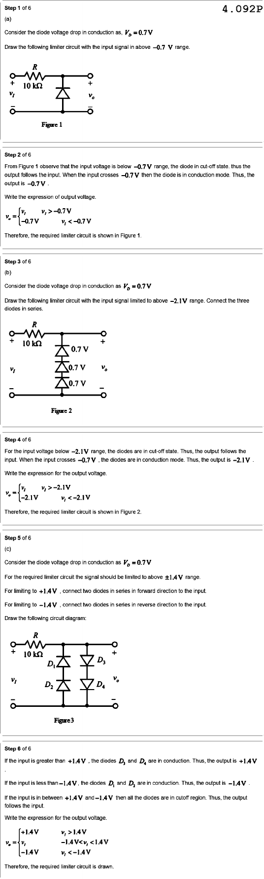 Step of 6 4.092P (a) Consider the diode voltage drop in conduction as, = Draw the following limiter circuit with the input signal in above -0.7 V range. R + + v₁ - Figure 1 Step of 6 From Figure 1 observe that the input voltage is below -0.7V range, the diode in cut-off state. thus the output follows the input. When the input crosses -0.7V then the diode is in conduction mode. Thus, the output is -0.7V Write the expression of output voltage. -0.7V Therefore, the required limiter circuit is shown in Figure 1. Step of 6 (b) Consider the diode voltage drop in conduction as = Draw the following limiter circuit with the input signal limited to above -2.1V range. Connect the three diodes in series. R + 10 kΩ + 0.7 V 0.7 V 0.7 V - - Figure 2 Step of 6 For the input voltage below -2.1V range, the diodes are in cut-off state. Thus, the output follows the input. When the input crosses -0.7V the diodes are in conduction mode. Thus, the output is Write the expression for the output voltage. = Therefore, the required limiter circuit is shown in Figure 2. Step of 6 (c) Consider the diode voltage drop in conduction as For the required limiter circuit the signal should be limited to above +1.4V range. For limiting to +1.4V connect two diodes in series in forward direction to the input. For limiting to -1.4V connect two diodes in series in reverse direction to the input. Draw the following circuit diagram: R + 10 kΩ + D₁ D₃ D₂ - Figure 3 Step of 6 If the input is greater than +1.4V the diodes D, and are in conduction. Thus, the output is +1.4V If the input is less than the diodes and are in conduction. Thus, the output is If the input is in between +1.4V and -1.4V then all the diodes are in cutoff region. Thus, the output follows the input. Write the expression for the output voltage. +1.4V v, >1.4V =
