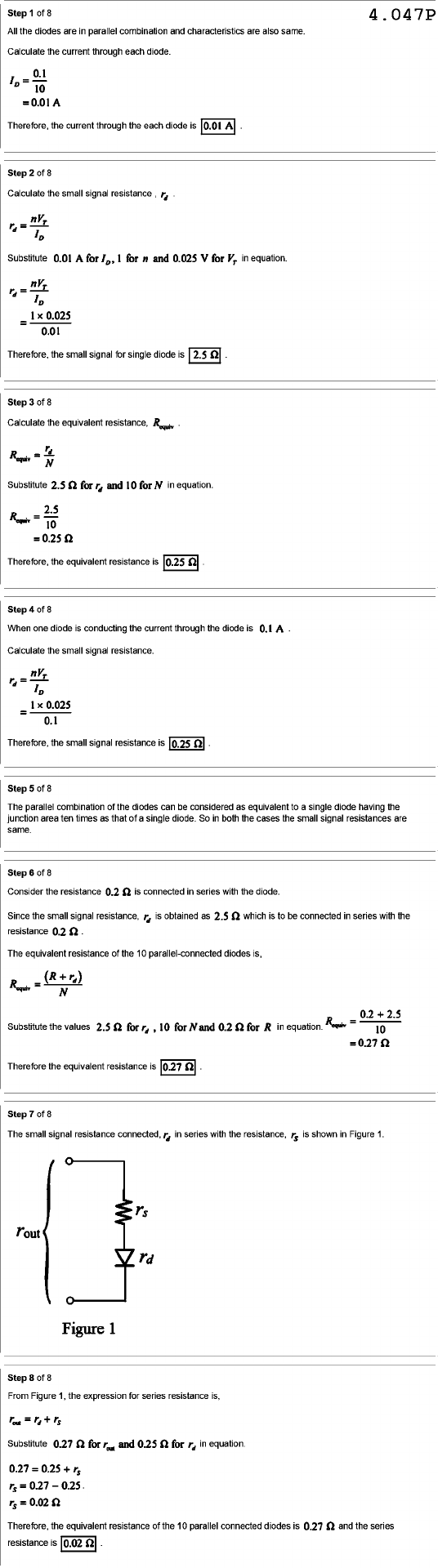 Step of 8 4.047P All the diodes are in parallel combination and characteristics are also same. Calculate the current through each diode. 0.1 10 = 0.01 A Therefore, the current through the each diode is 0.01 A Step of 8 Calculate the small signal rd Substitute 0.01 A for 1 for n and 0.025 V for in equation. rd 1x 0.025 = 0.01 Therefore, the small signal for single diode is 2.5 Ω Step of 8 Calculate the equivalent resistance, R = rd N Substitute 2.5 Ω for rd and 10 for N in equation. 2.5 10 = 0.25 Ω Therefore, the equivalent resistance is 0.25 Ω Step of 8 When one diode is conducting the current through the diode is 0.1 Calculate the small signal resistance. rd 0.025 = 0.1 Therefore, the small signal resistance is 0.25 Step of 8 The parallel combination of the diodes can be considered as equivalent to a single diode having the junction area ten times as that of a single diode. So in both the cases the small signal resistances are same. Step of 8 Consider the resistance 0.2 Ω is connected in series with the diode. Since the small signal resistance, rd is obtained as 2.5 Ω which is to be connected in series with the resistance 0.2 The equivalent resistance of the 10 parallel-connected diodes is, N = Substitute the values 2.5 Ω 10 for N and 0.2 for R in equation. 10 0.27 Ω Therefore the equivalent resistance is 0.27 Step of 8 The small signal resistance connected, rd in series with the resistance, rs is shown in Figure 1. rd Figure 1 Step of 8 From Figure 1, the expression for series resistance is, Substitute 0.27 Ω for and 0.25 Ω for rd in equation. 0.27 0.25 + 0.27 Ω Therefore, the equivalent resistance of the 10 parallel connected diodes is 0.27 Ω and the series resistance is