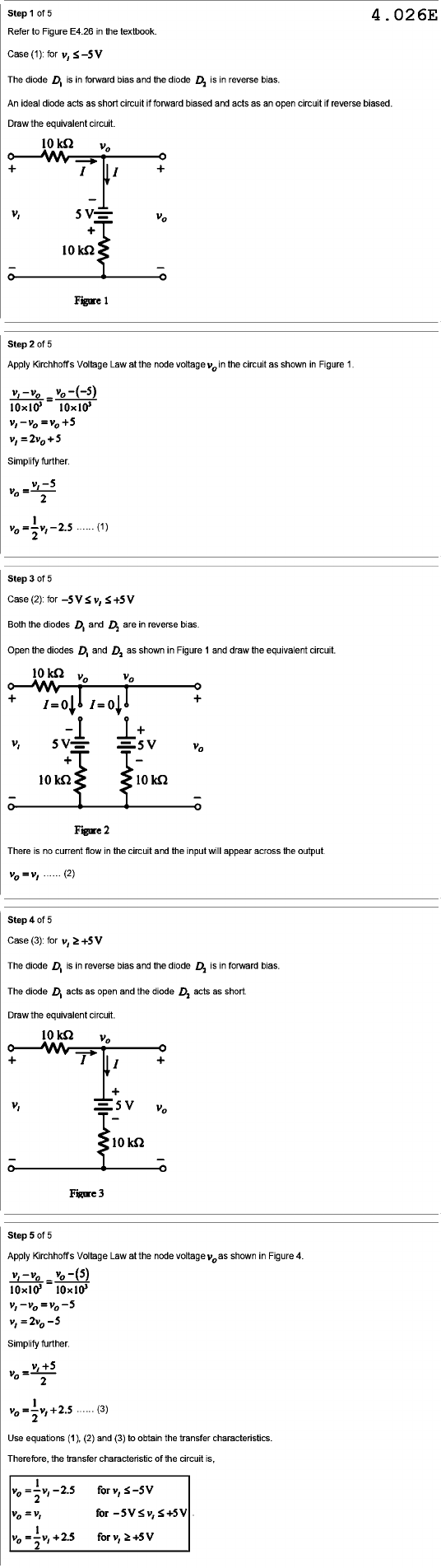 Step of 5 4.026E Refer to Figure E4.26 in the textbook. Case (1): for The diode is in forward bias and the diode is in reverse bias. An ideal diode acts as short circuit if forward biased and acts as an open circuit if reverse biased. Draw the equivalent circuit. + I I + - v, + - Figure 1 Step of 5 Apply Kirchhoff's Voltage Law at the node voltage in the circuit as shown in Figure 1. = v, Simplify further. 2 (1) Step of 5 Case (2): for Both the diodes and D2 are in reverse bias. Open the diodes and 2 as shown in Figure 1 and draw the equivalent circuit. + + - + v, 5V V + - 10 kΩ - Figure 2 There is no current flow in the circuit and the input will appear across the output (2) Step of 5 Case (3): for v, The diode D, is in reverse bias and the diode D2 is in forward bias. The diode D, acts as open and the diode D2 acts as short. Draw the equivalent circuit. + I + + v, 5V - - Figure 3 Step of 5 Apply Kirchhoff's Voltage Law at the node voltage as shown in Figure 4. = Simplify further. v,+5 2 = 2 +2.5 (3) Use equations (1), (2) and (3) to obtain the transfer characteristics. Therefore, the transfer characteristic of the circuit is, 2 1 =v, for for V