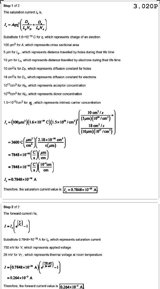 Step 1 of 2 3.020P The saturation current is, I, = + Substitute C for q, which represents charge of an electron 100 µm² for A, which represents cross sectional area 5 for which represents distance travelled by holes during their life time 10 µm for which represents distance travelled by electrons during their life time 10 cm²/s for Dp, which represents diffusion constant for holes 18 cm²/s for which represents diffusion constant for electrons for NA, which represents acceptor concentration for ND, which represents donor concentration for n, which represents intrinsic carrier concentration = = = Therefore, the saturation current value is Step 2 of 2 The forward current / is, Substitute A for Is which represents saturation current 750 mV for V, which represents applied voltage 26 mV for VT, which represents thermal voltage at room temperature Therefore, the forward current value is