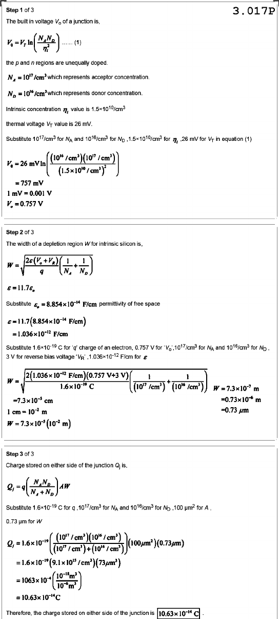 Step 1 of 3 3.017P The built in voltage V₀ of a junction is, (1) the p and n regions are unequally doped. N, = which represents acceptor concentration. = which represents donor concentration. Intrinsic concentration value is thermal voltage VT value is 26 mV. Substitute for NA and for ND for mV for VT in equation (1) = 26 = 757 mV 1 mV = 0.001 V V. = 0.757 V Step 2 of 3 The width of a depletion region W for intrinsic silicon is, Substitute F/cm permittivity of free space E =1.036x10⁻¹² F/cm Substitute C for 'q' charge of an electron, 0.757 V for for NA and for 3 V for reverse bias voltage 'VR' F/cm for E W m m Step 3 of 3 Charge stored on either side of the junction Qj is, Substitute C for q for NA and for ND ,100 µm² for A, 0.73 for W = Therefore, the charge stored on either side of the junction is
