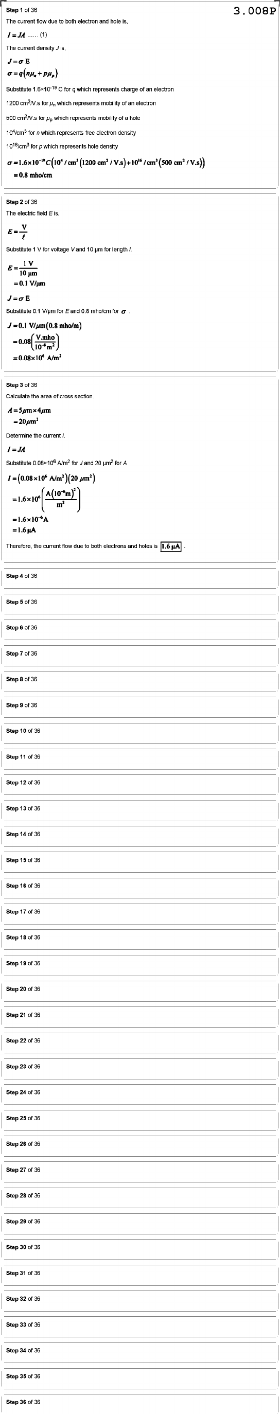 Step 36 3.008P The current flow due to both electron and hole I JA (1) The current density is, J=σ E σ Substitute C for which represents charge of an electron 1200 for Pn which represents mobility of electron 500 for which represents mobility of hole for n which represents free electron density for p which represents hole density = 0.8 mho/cm Step 36 The electric field V Substitute for voltage Vand 10 for length E 10 0.1 J E Substitute 0. for E and 0.8 mho/cm for σ V/µm(0.8 mho/m) V.mho = 0.08 = A/m2 Step 36 Calculate the area of cross Determine the current I Substitute 106 A/m2 for Jand 20 for A Therefore, the current flow due to both electrons and holes is Step 36 Step 5 of 36 Step 6 of 36 Step 7 of 36 Step 36 Step 9 of 36 Step 10 of 36 Step 36 Step 36 Step 36 Step 36 Step 36 Step 36 Step 36 Step 36 Step 36 Step 20 36 Step 36 Step 22 36 Step 36 Step 36 Step 25 36 Step 26 36 Step 36 Step 28 36 Step 36 Step 36 Step 36 Step 32 36 Step 36 Step 36 Step 36 Step 36