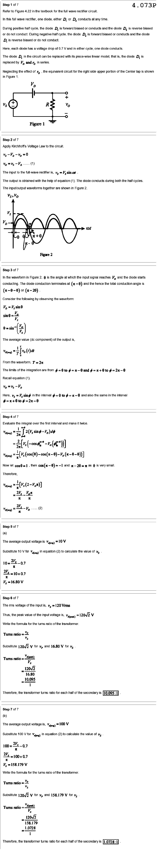 Step of 7 4.073P Refer Figure 4.22 in the textbook for the full wave rectifier circuit. In this full wave rectifier, one diode, either or conducts at any time. During positive half cycle, the diode is forward biased or conducts and the diode D2 reverse biased or do not conduct. During negative cycle, the diode D2 is forward biased or conducts and the diode reverse biased or do not conduct each diode has voltage drop of 0.7 V and in either cycle, one diode conducts The diode D, in the circuit can be replaced with its piece-wise linear model, that the diode is replaced by in series. Neglecting the effect of the equivalent circuit for the right side upper portion of the Center tap is shown Figure + R 10 Figure Step 2 of 7 Apply Voltage Law to the circuit The input to the full-wave rectifier is, The output is obtained with the help of equation (1). The diode conducts during both the half cycles The input/output waveforms together are shown in Figure 2. VD Figure Step In the Figure 2, 0 the angle at which the input signal reaches and the diode starts conducting. The diode conduction terminates at (x-9) and the hence the total conduction angle is Consider the following by observing the waveform: The average value (dc component) of the output is, From the waveform, T=2π The limits of the integration are from to and to Recall equation (1). Here, - in the interval to and also the same in the interval Step Evaluate the integral over the first interval and make twice 2 Now let then and as 0 Therefore, 2V, π (2) Step 5 of 7 (a) The average output voltage is Substitute for in equation (2) calculate the value of 2V, Step of 7 The rms voltage of the input is, 120 Vrms Thus, the peak value the input voltage is, V Write the formula for the turns ratio of the transformer Turns ratio Substitute V for and 16.80 V for Turns ratio 16.80 10.095 Therefore, the transformer turns ratio for each half of the secondary is 10.095:1 Step 7 of (b) The average output voltage is. = 100 V Substitute 100 for in equation (2) calculate the value of 100= Write the formula for the turns ratio of the transformer Turns ratio Substitute V for and 158.179 V for Turns ratio 158.179 1.0728 1 Therefore, the transformer turns ratio for each half of the secondary is .0728